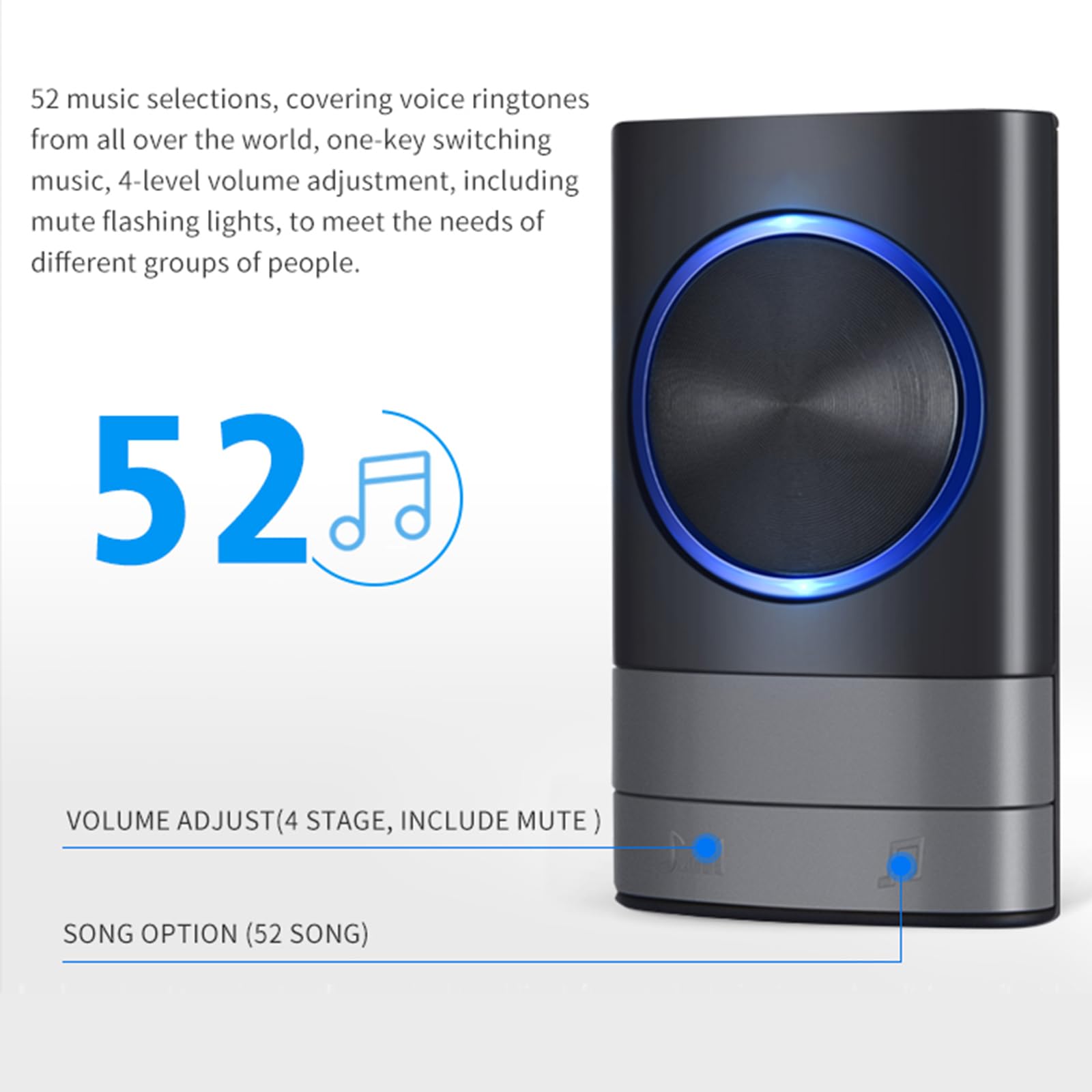 52 Canzoni, 4 Livelli Di Volume: Questo campanello wireless dispone di 52 suonerie melodiche provenienti da tutto il mondo, che possono essere modificate con la semplice pressione di un pulsante. Questo prodotto ha quattro livelli di volume regolabili (compresa la modalità silenziosa) e dispone anche di un flash blu, la modalità silenziosa si accende sempre per soddisfare le diverse esigenze.