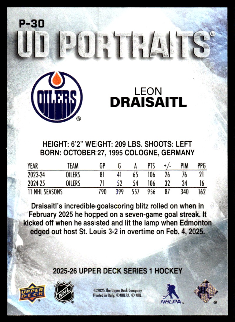 | 2025-26 Upper Deck Series 1 UD Portraits Leon Draisaitl Edmonton Oilers #P-30 |