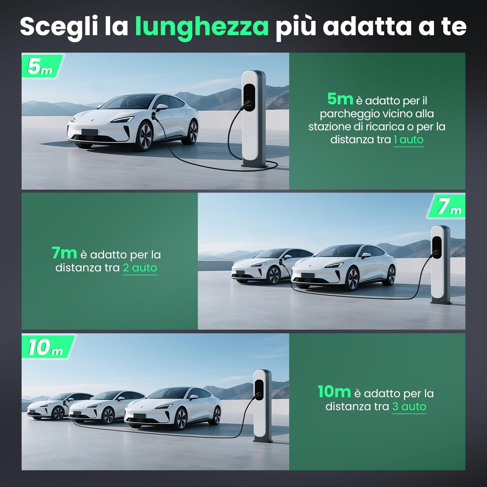 Scegli la lunghezza adatta: 5m è adatto per la distanza tra 1 auto, 7m è adatto per la distanza tra 2 auto e 10m è adatto per la distanza tra 3 auto. Il cavo è dotato di una resistente borsa per il trasporto e di velcro, ideale per riporre i cavi di ricarica dei veicoli elettrici