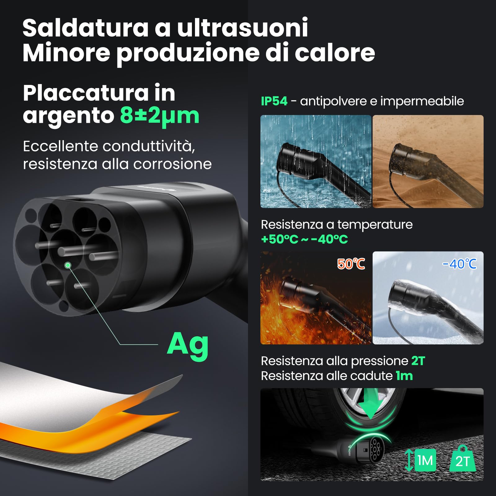 Qualità premium: Il cavo tipo 2 7 metri utilizza la tecnologia di saldatura a ultrasuoni, che presenta un aumento di temperatura inferiore rispetto alla tecnologia di saldatura tradizionale, per proteggere la sicurezza tua e della tua auto. La spina con contatti argentati da 8±2 micron garantisce una migliore conduttività e resistenza alla corrosione, garantendo un'eccellente durata