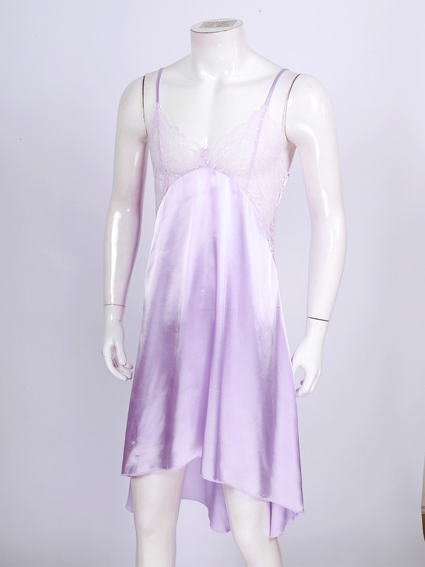Mens Sheer Lace Patchwork Satin Nightdress Irregular Hem Adjustable Spaghetti Straps Dress.