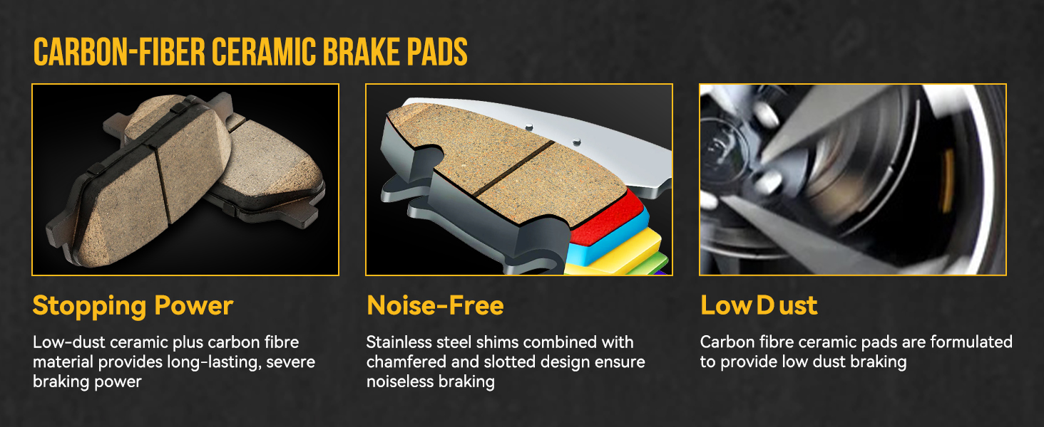 High-end ceramic brake pads with stable braking performance, chamfering design makes the brake pads fit better with the brake discs, safe and quiet without damaging the brake rotors.