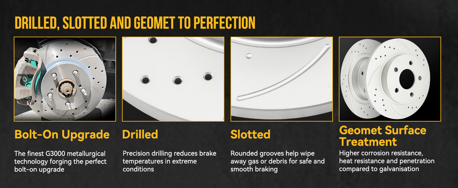 Drilled and slotted disc brake rotors can effectively shorten the braking distance, enhance the heat dissipation effect, reduce the deformation of the brake disc, and prevent the water film effect in rainy days.