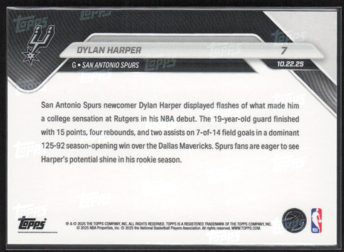 | 2025-26 Topps Now NBA Debut Dylan Harper San Antonio Spurs #7 | ||||||||||||||||||