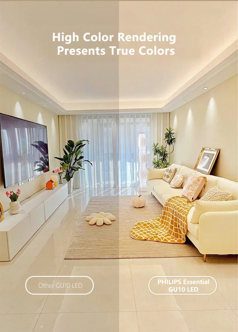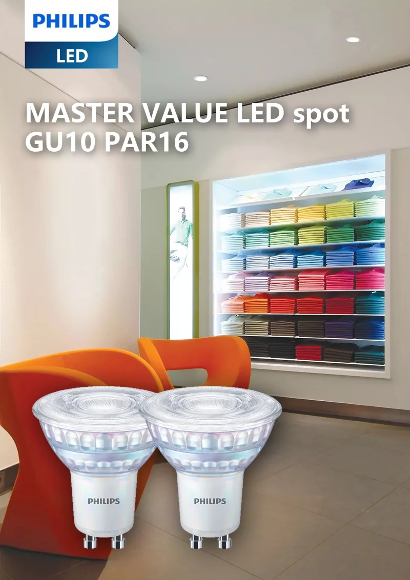 Delivering a warm, halogen-like accent beam, MASTER VALUE is a perfect fit for spot lighting. Thanks to its high CRI, it realizes more natural colors, creating cozy and comfortable ambiences for residential and hospitality projects, and emphasizing the beauty of merchandise in retail. These LED spots MV GU10 have the familiar look and feel of spot lamps, keeping the classic beauty of glass spots and adding the strong performance of LED technology. The dimming function enables you to create the atmosphere you desire, and it works with broad selection of dimmers. MASTER VALUE also offers more energy savings that normal LED spots.