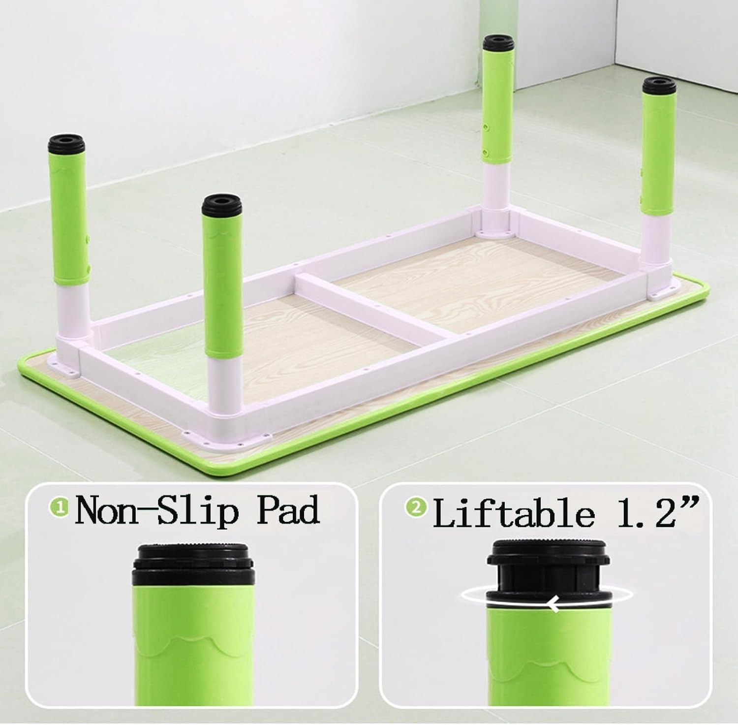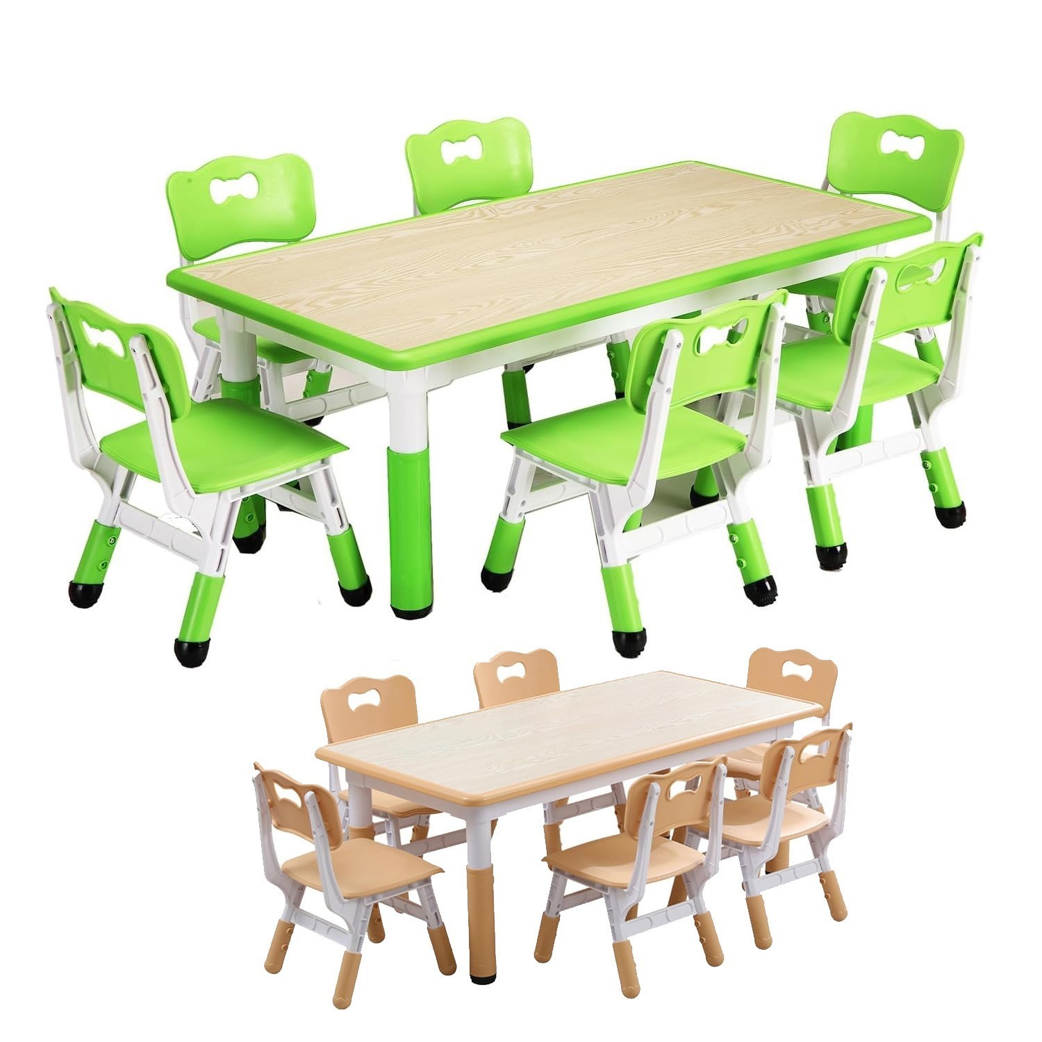 【Multifunctional Desk and Chair Set】: Kids Desk and Chair Set Includes 1 Desk and 6 Chairs,it is great for eating, activities, drawing and so much more,it's very comfortable for baby who likes to sit and just enjoy the view of outside,provides a relaxing space to unleash artistic potential. 【Height Adjustable】:Both table and chair can adjust the height,The table to adjust from 18.9”-23.6”, 3 level for chairs to adjust from 10.6”-12.2”, and table weight capacity up to 300 LBS,and the weight of the chair is 200 LB.Both the table and chair are easy to assemble.Follow the instruction book having both printed directions and diagrams. 【Ergonomically Designed Chairs】: Each chair has a curved support back to promote proper sitting posture and can protect the back to prevent hunchback. 【Sturdy and Safe Material】:This toddler table and chair set is crafted from the safest, ensuring durability and sturdiness. The seat surface features a non-slip texture for enhanced safety. The chairs are equipped with black bottom feet to prevent sliding on wooden floors. 【Awesome table and chairs】: This table and chair set is a perfect fit for kids' playrooms, homes, school rooms, and daycare centers. Designed for toddlers and kids between the ages of 2-10, it provides a versatile space for activities such as studying, playing, and daycare use.About this item