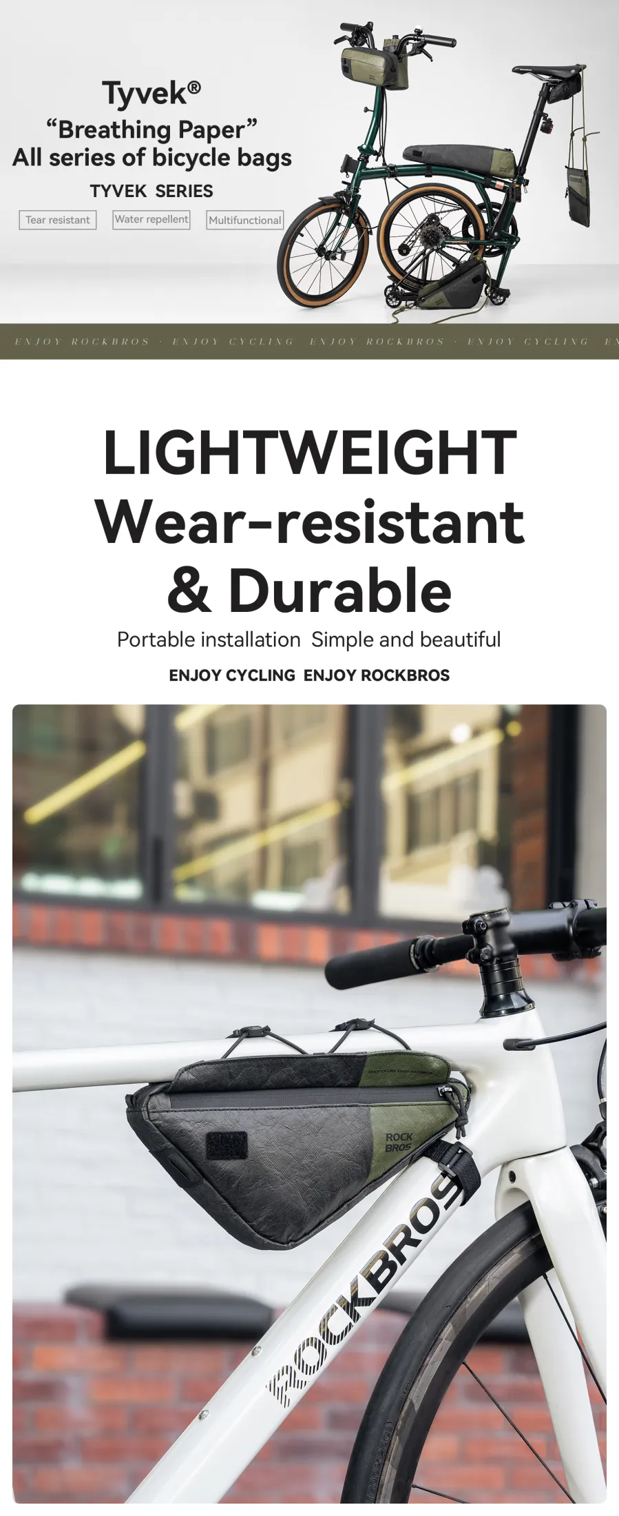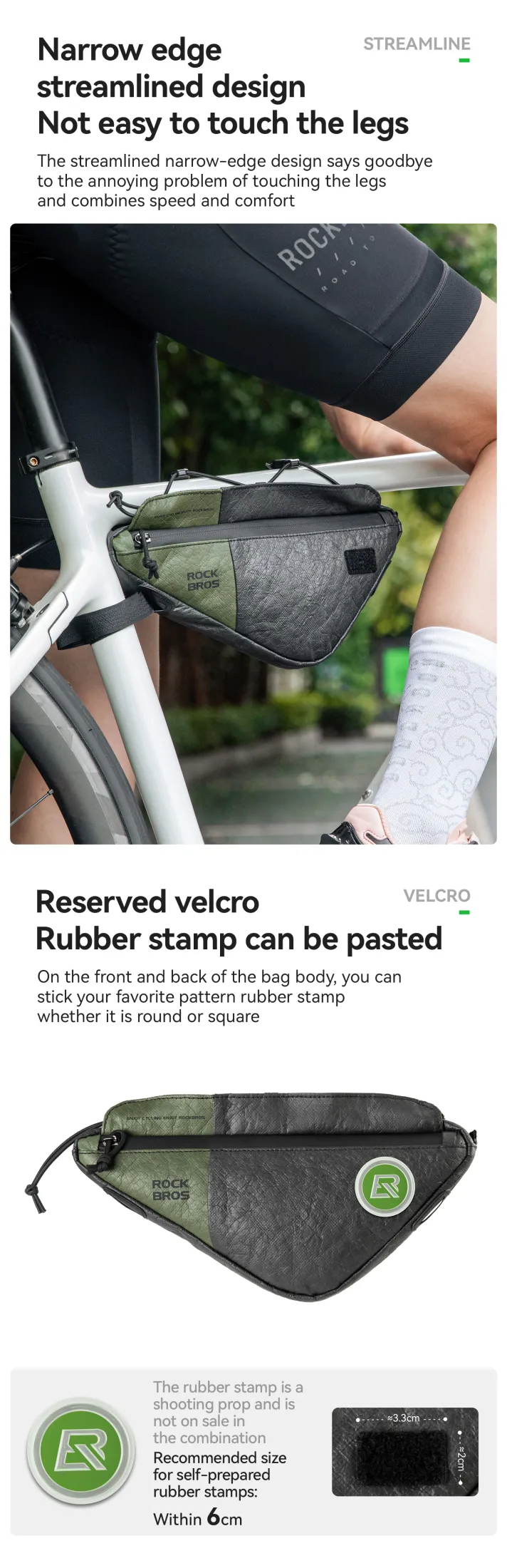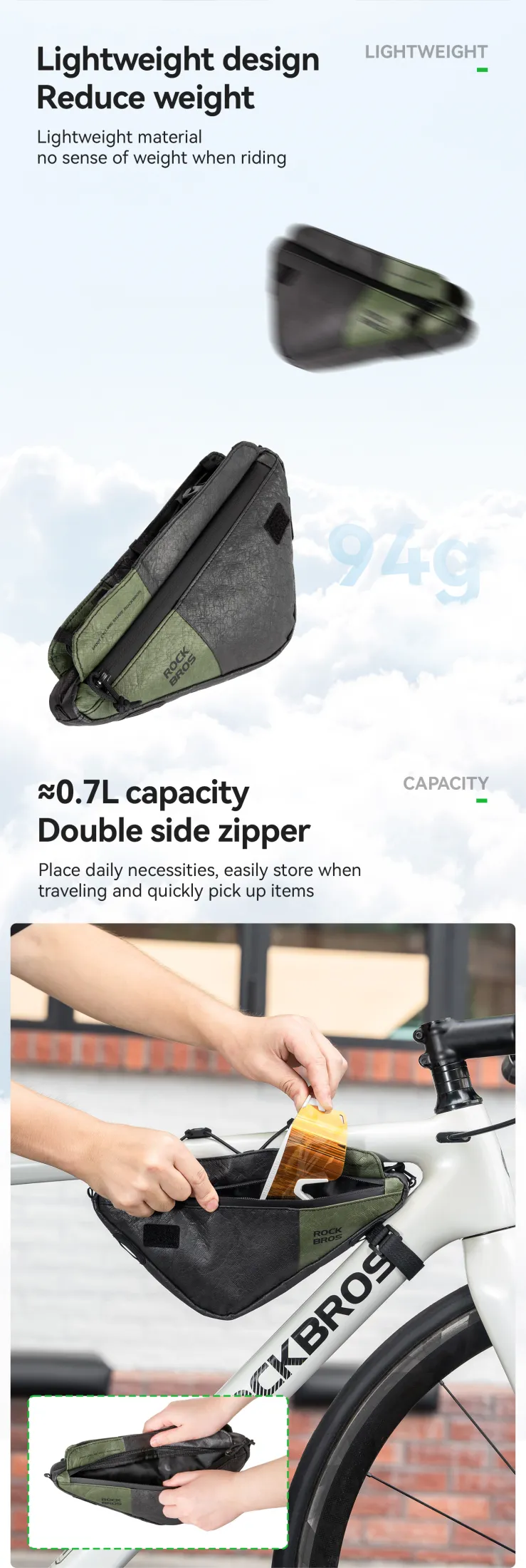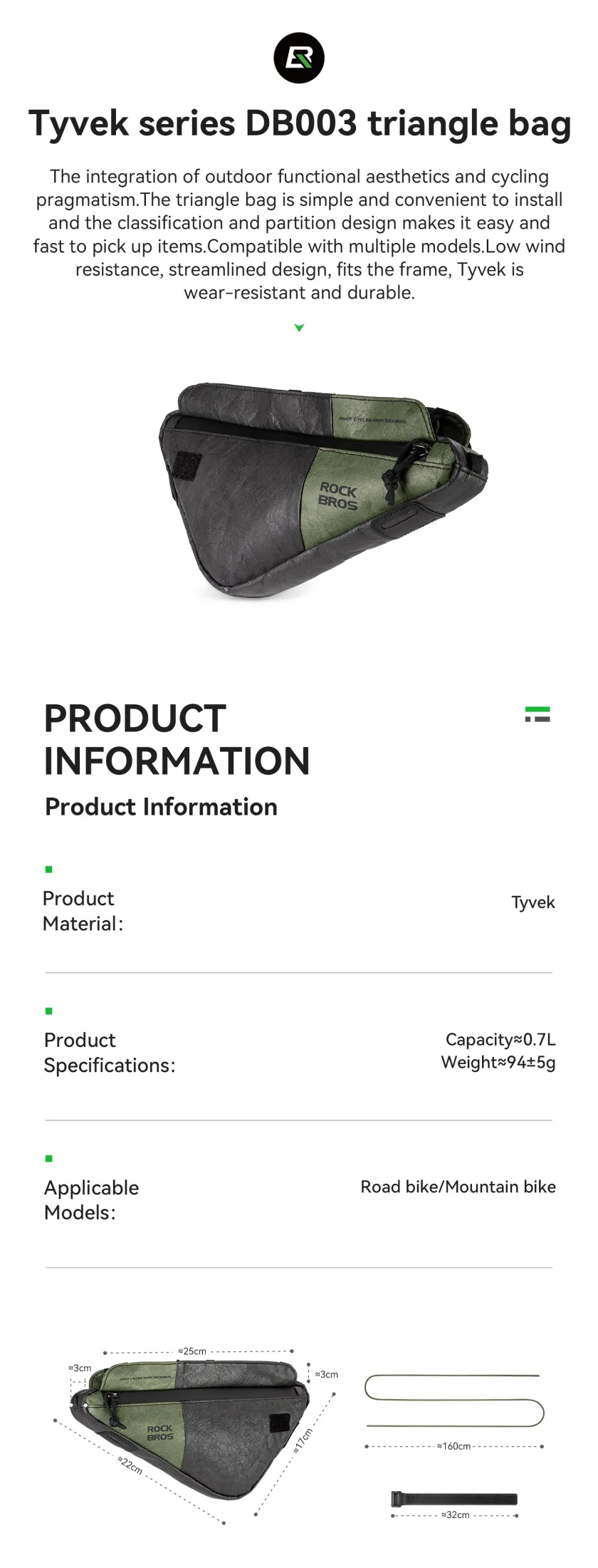 Product Information Brand:ROCKBROS Name:Tyvek series DB003 triangle bag Product Material:Tyvek Capacity≈0.7L Weight≈94±5g Applicable Models:Road bike/Mountain bike