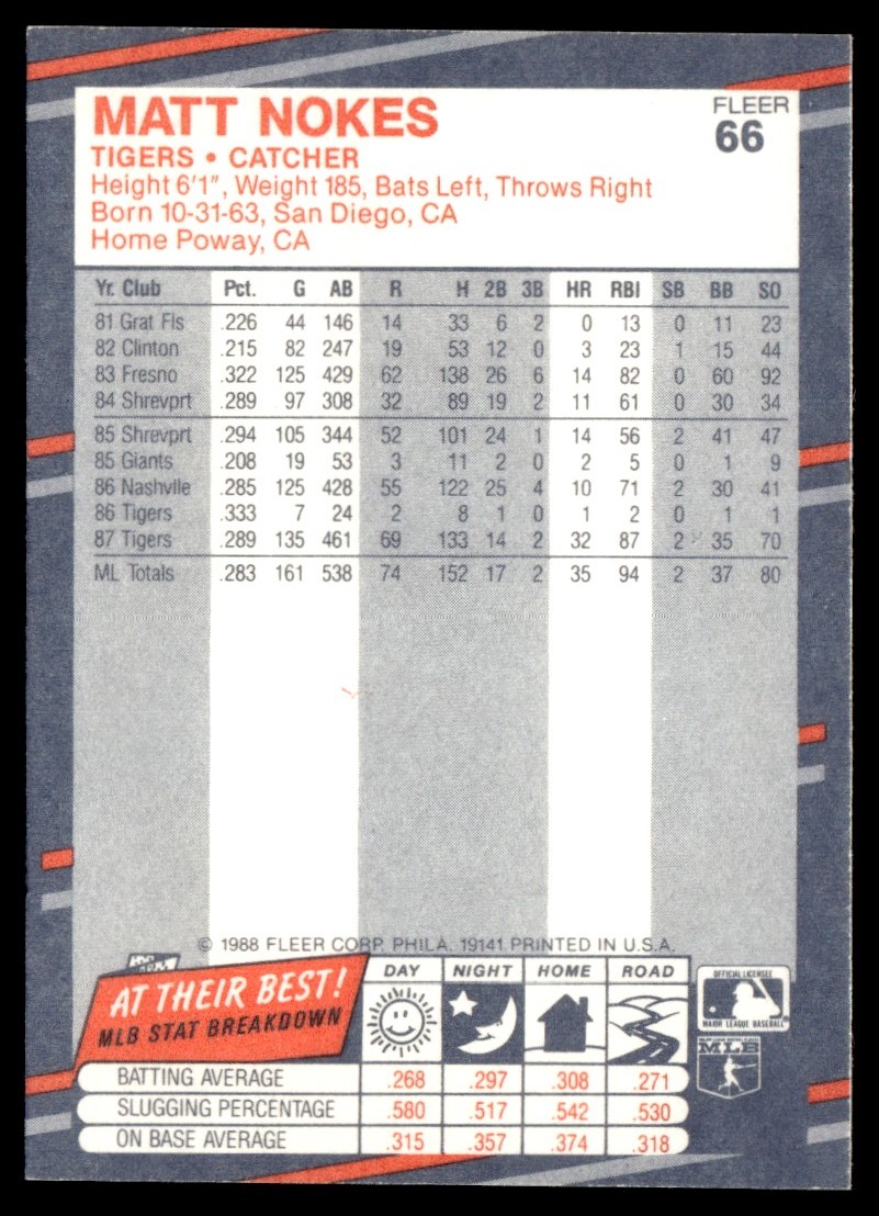 1988 Fleer Matt Nokes Rookie Detroit Tigers #66