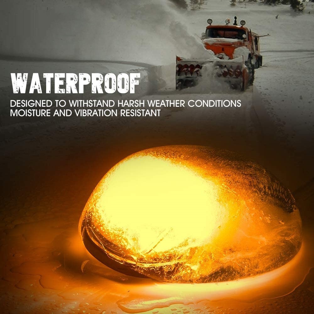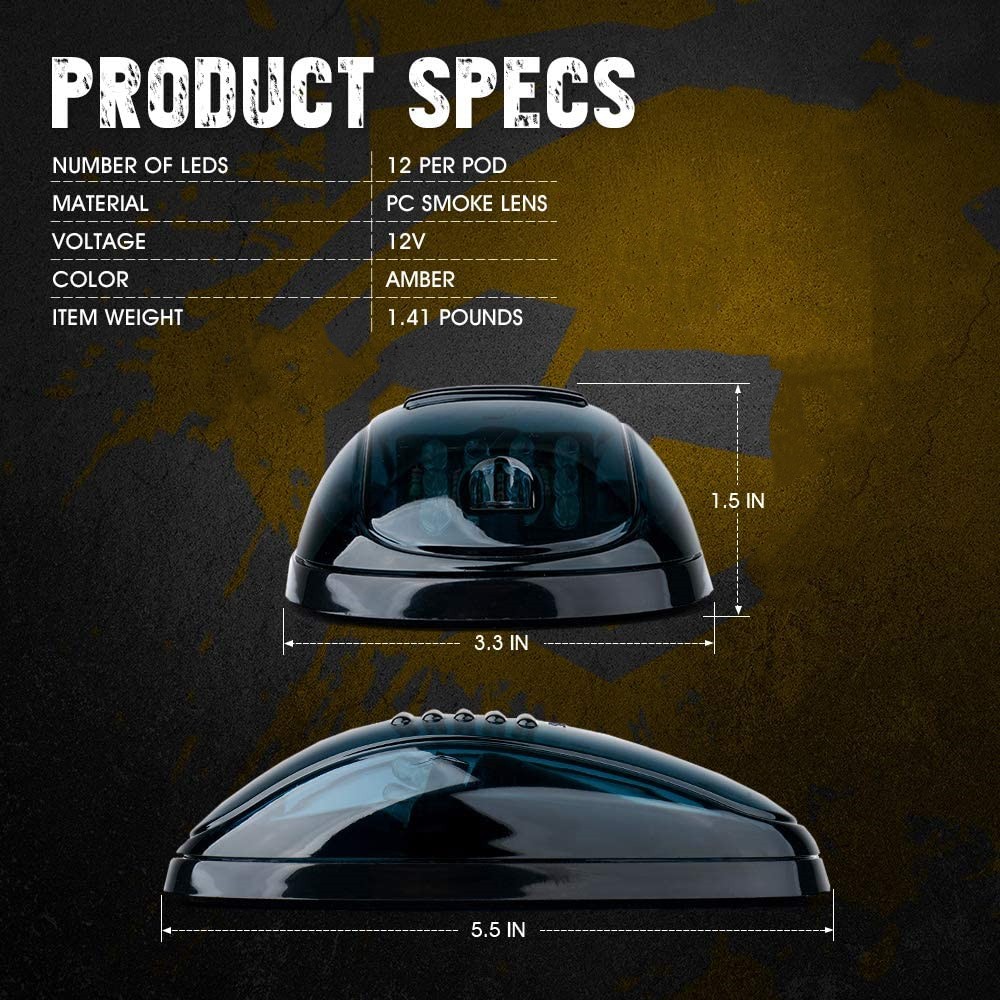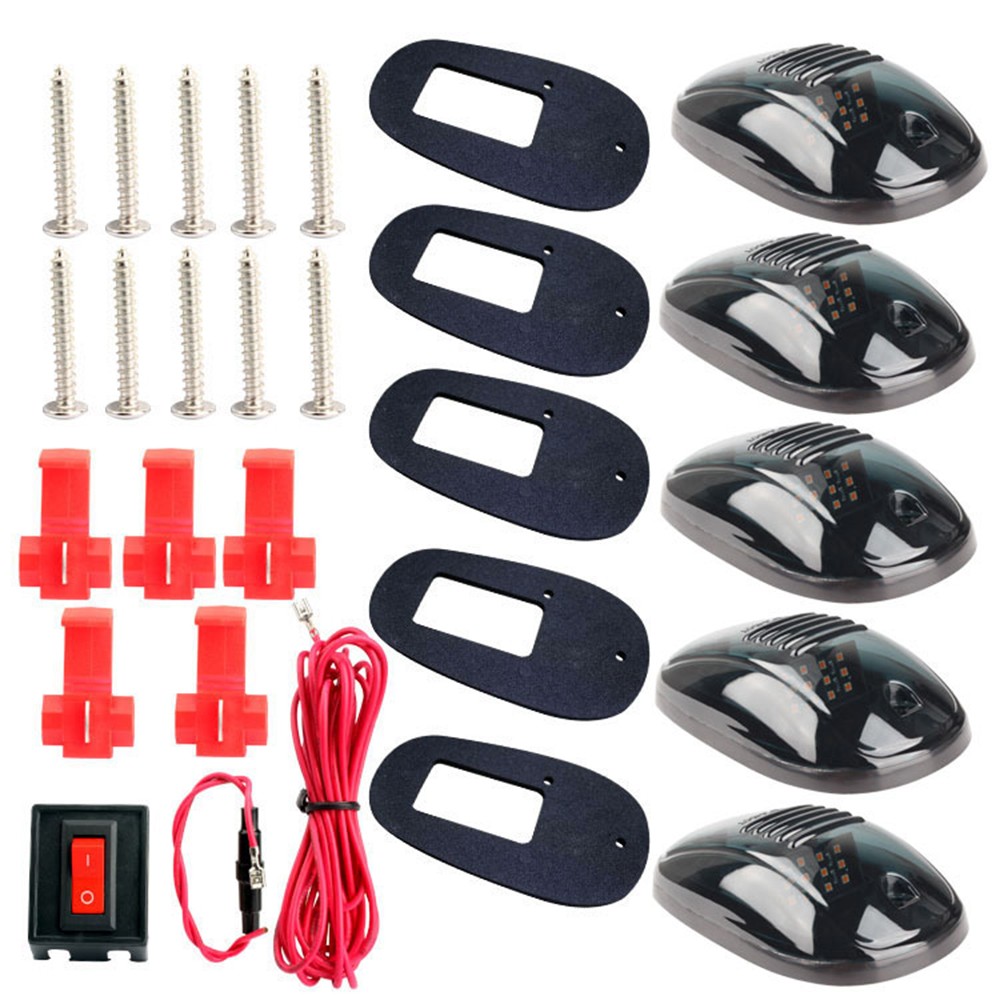 Features: UNIVERSAL FIT : Universal for all vehicles with a 12V power source and with Stock Roof Cab Marker. HIGH QUALITY: Every kit features super strong ABS plastic lenses which have been UV treated so they will not fade from prolonged exposure to sunlight and weather elements; soft pads included, fit for fast feet or curved roofs. WATERPROOF AND PROTECTION: Waterproof can be used in heavy rain, ultra bright high quality LED provide better visibility during night time, dense fog, heavy rain, and snow. EASY TO INSTALL: Just remove your factory cab lights and bolt these in their place.convenient for modifying & rewiring. Wiring: Black is to Ground and Red is to Positive. Modification or drilling might be required for the non-installed vehicles. Specifications: Type: 12 LED Cab Roof Top Marker Light Working voltage: 12V Current: 0.08A Power lead length: 11CM Lamp size: 5.54" x 3.27" x 1.50" Material: ABS + PC Light Cover Shell color: Smoked Light color: Amber yellow Waterproof rating: IP68 Application: Cab Marker Lights, Roof Cab Marker, Roof Running Light, Clearance Light Package Included: 5 x roof cab LED lights (Smoked Lens with Amber color) Switch and All necessary hardware