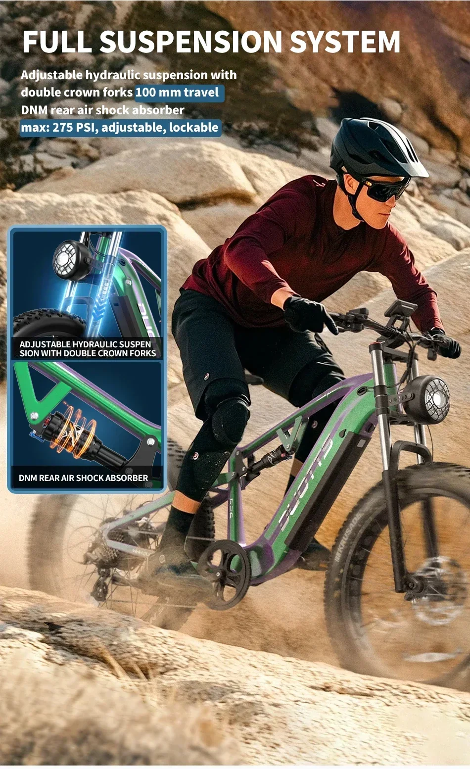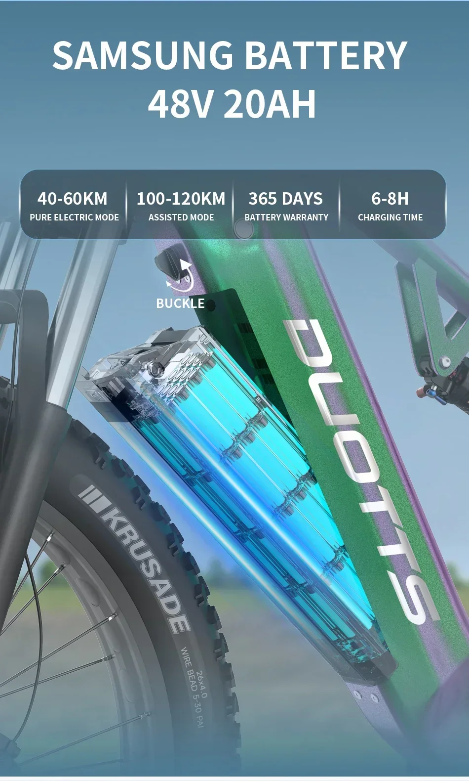 The 48V 20Ah (960Wh) Samsung 21700 lithium battery pack is integrated into the frame to provide dual protection against water and dust, long battery life, safety, and reliability, with strong and stable output. The pedal-assisted mode ranges 120km, providing plenty of power output for a comfortable ride.