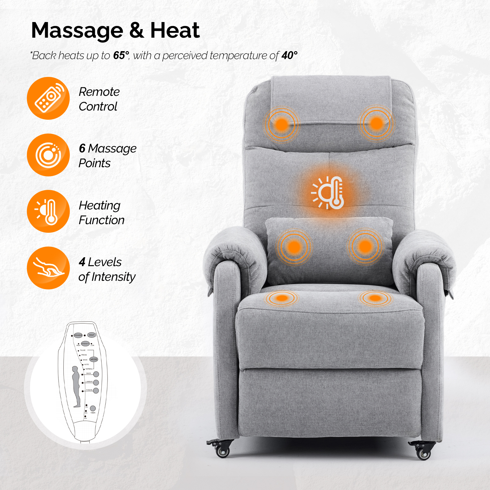 【Luxurious Massage Experience】Unwind with our electric recliner armchair, featuring six massage points and a soothing heating function. This massage chair is designed to activate and relax your back and leg muscles, offering the ultimate in relaxation. Whether you're recovering from a long day or simply enjoying some downtime, this recliner provides salon-quality massage right in your living room.