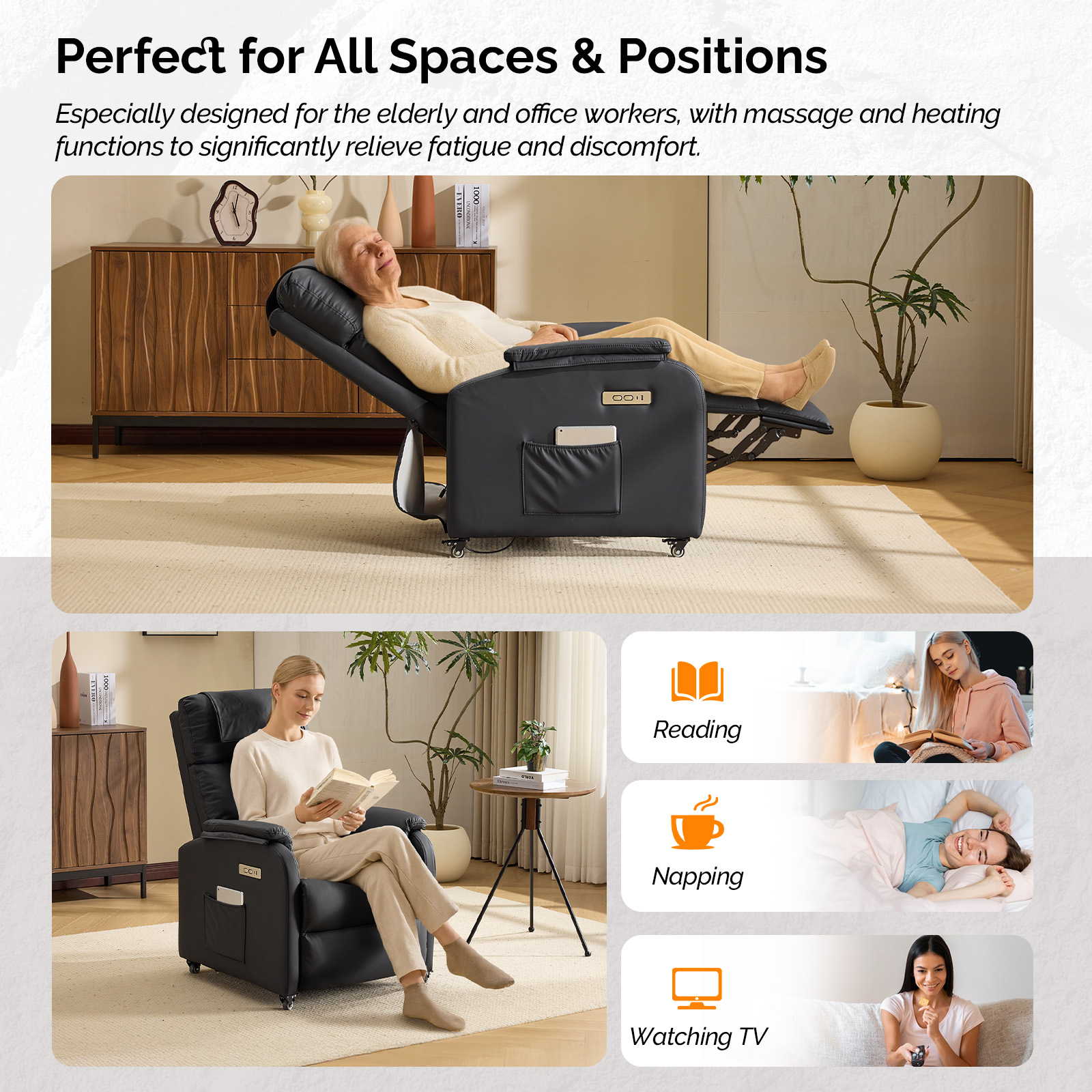 【Convenient One-Touch Controls】Experience the ultimate in convenience with our reclining chairs. With automatic reclining and remote-controlled massage functions, you can adjust the tilt and massage settings with just a few button presses. Whether you're an elderly person, a petite woman, or a child, this recliner is designed for easy use.