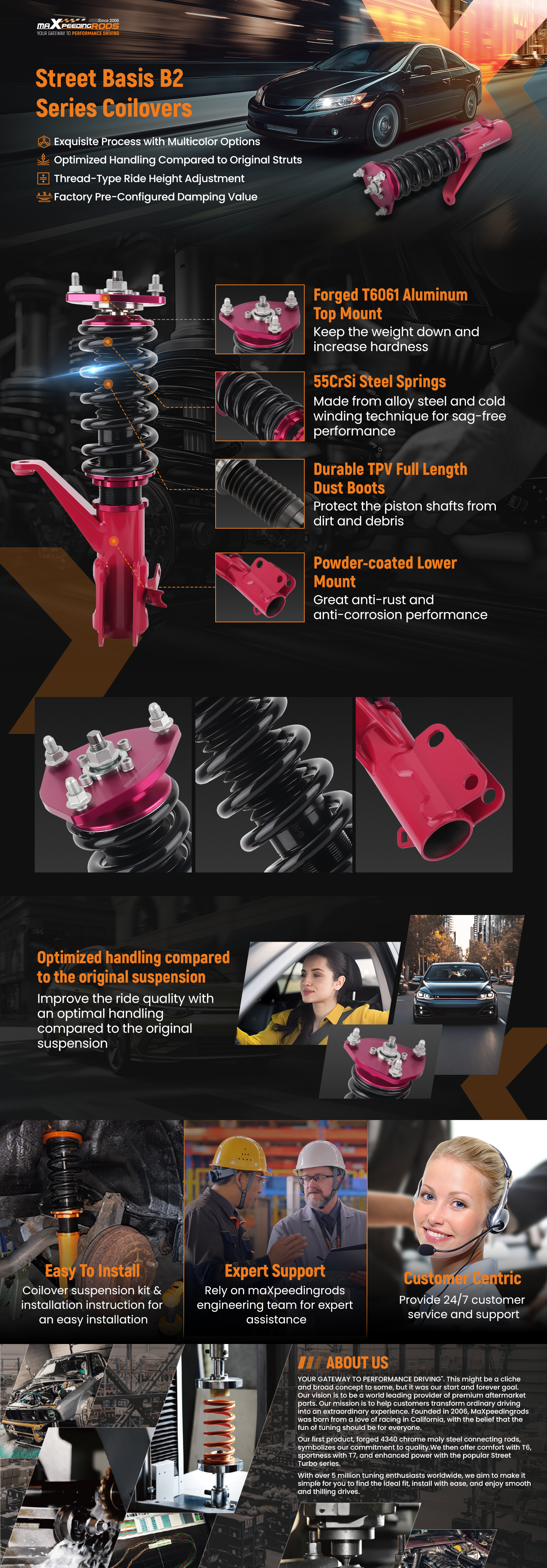 MXR-B2 coil-overs are designed as entry-level for street use. It features height adjustable and adjustable camber plates (applicable for some vehicles), which offer you a lowered stance, and improved performance for your daily use vehicle.