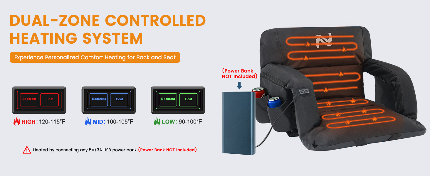 𝐂𝐮𝐬𝐭𝐨𝐦𝐢𝐳𝐞𝐝 𝐂𝐨𝐦𝐟𝐨𝐫𝐭: Our heated stadium seats for bleachers with Newest Dual-zone Controlled Heating System, it allows you to adjust the temperature of the backrest and seat cushion independently, offering flexibility and energy efficiency. Experience hours of soothing heat using a USB power bank and stay cozy even in chilly weather. Choose from 3 heat levels (high, mid, low) and reach a max temp of 120°F. Please NOTE: Power Bank NOT included.