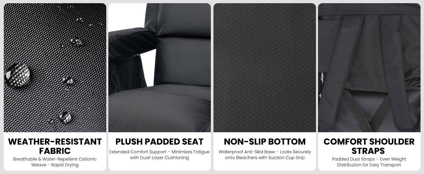 𝐃𝐮𝐫𝐚𝐛𝐥𝐞 𝐚𝐧𝐝 𝐒𝐮𝐩𝐩𝐨𝐫𝐭𝐢𝐯𝐞: Stadium seats for bleachers with back support surface is made of waterproof 600D Oxford cloth, providing resistance to accidental splashes and light rain, ensuring you can use it without worries in any weather conditions. Bottom is made of PVC leather with raised granules, providing increased traction and easy cleaning. Moreover, the seat frame is built to last, withstanding prolonged usage and providing reliable support for different weights.