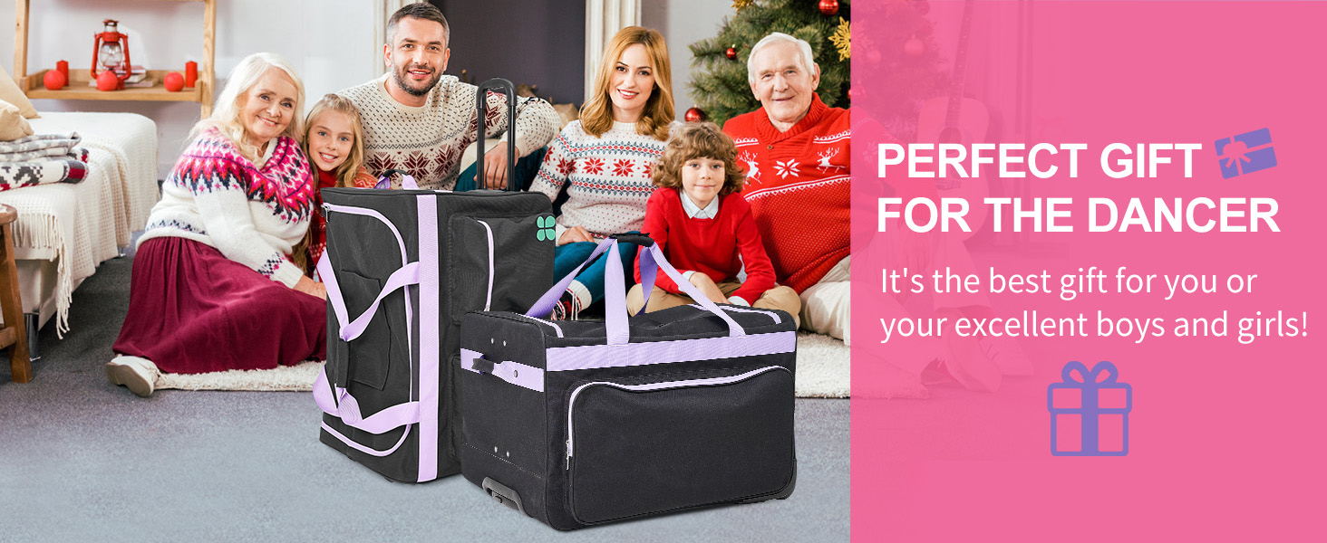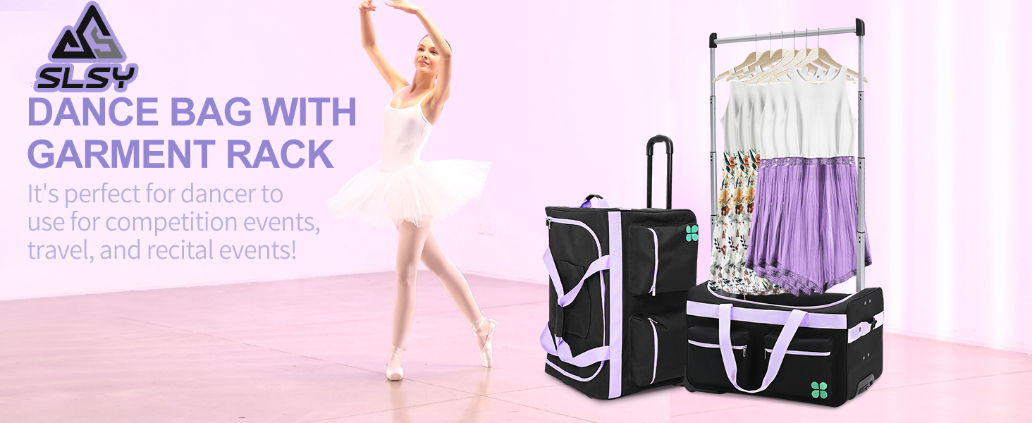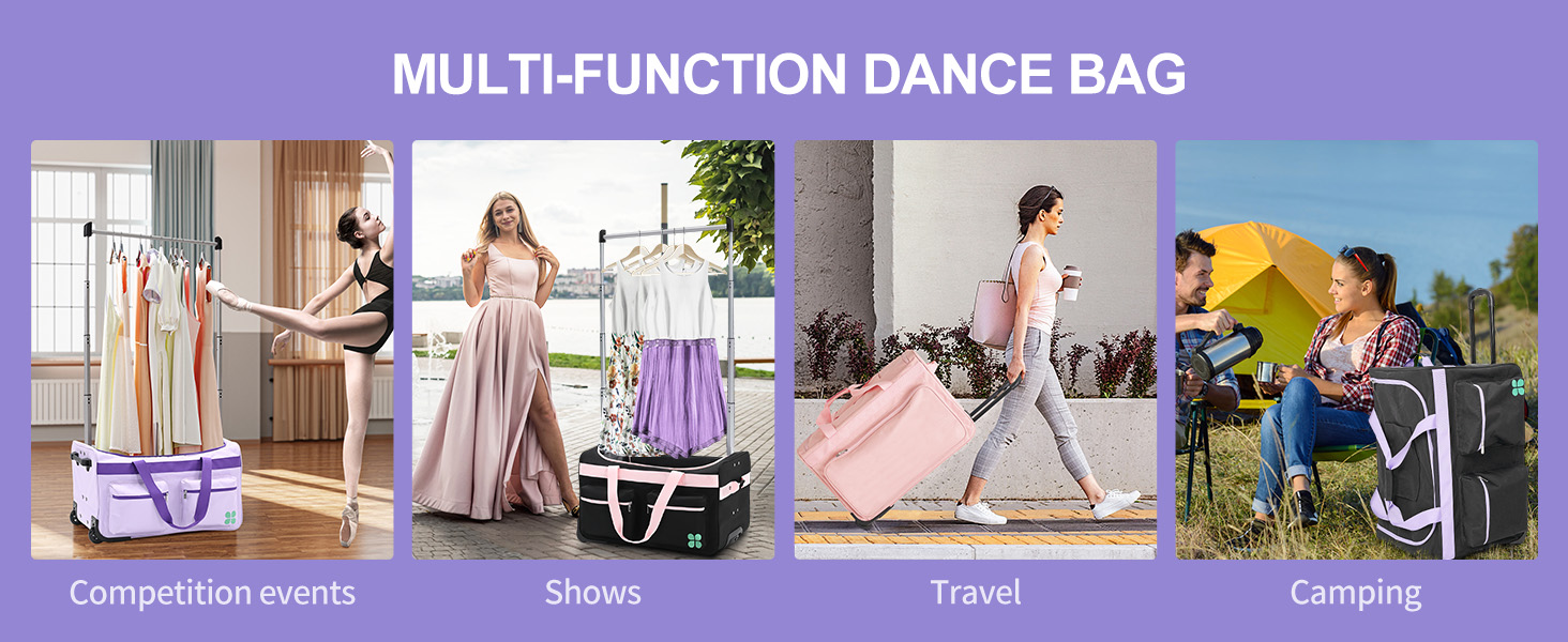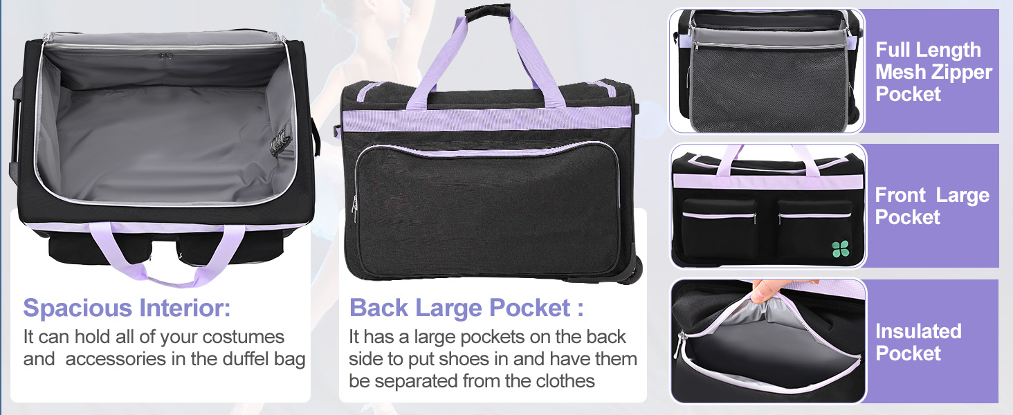 Update Dance Bag –Luggage size: 27.2 "x18.9" x18.1",combines a garment rack tall up to 49.2 inch . The garment duffle bag comes with multiple side and inner pockets, and a specially designed insulated bag on the side. The small-sized version is more portable.
