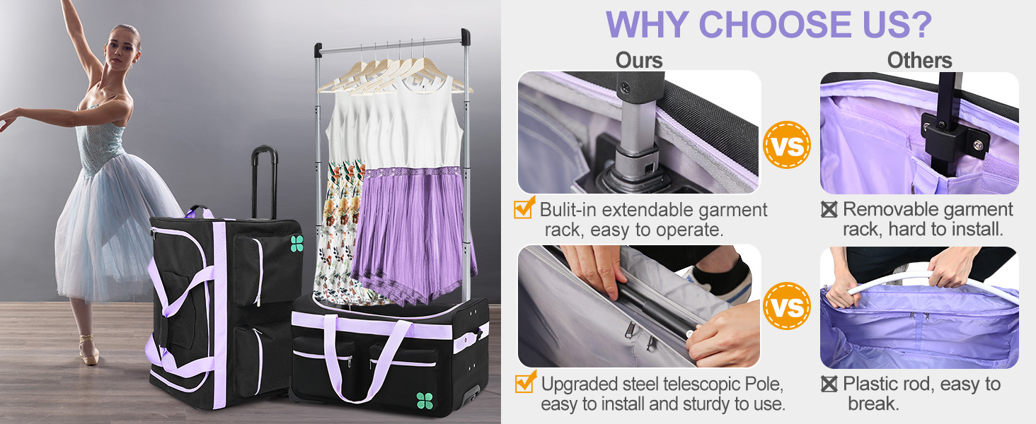 PREMIUM MATERIALS – The garment bag is made of high-quality materials that make it sturdy and stylish. Ripstop waterproof polyester fabric is scratch-resistant, anti-tear and anti water splashing, which can better protect your suit or dress.The smooth silent wheels and lightweight durable aluminum extendable garment rack make our dance bag the best choice for dancers.