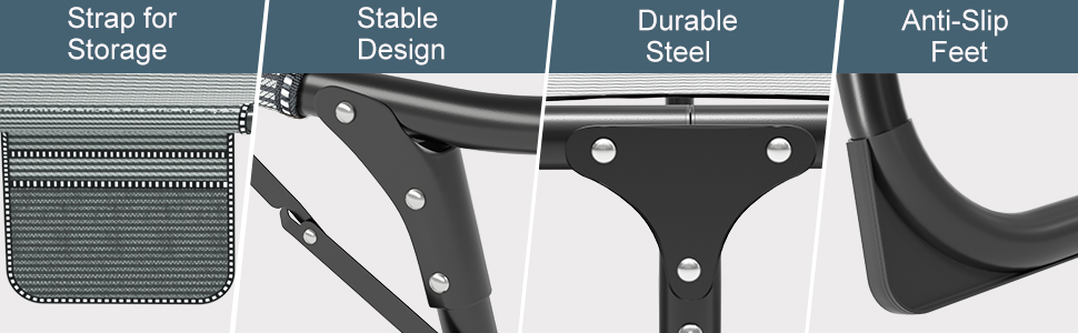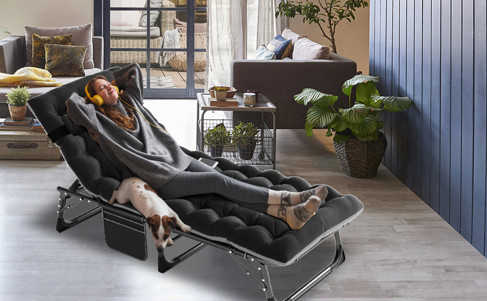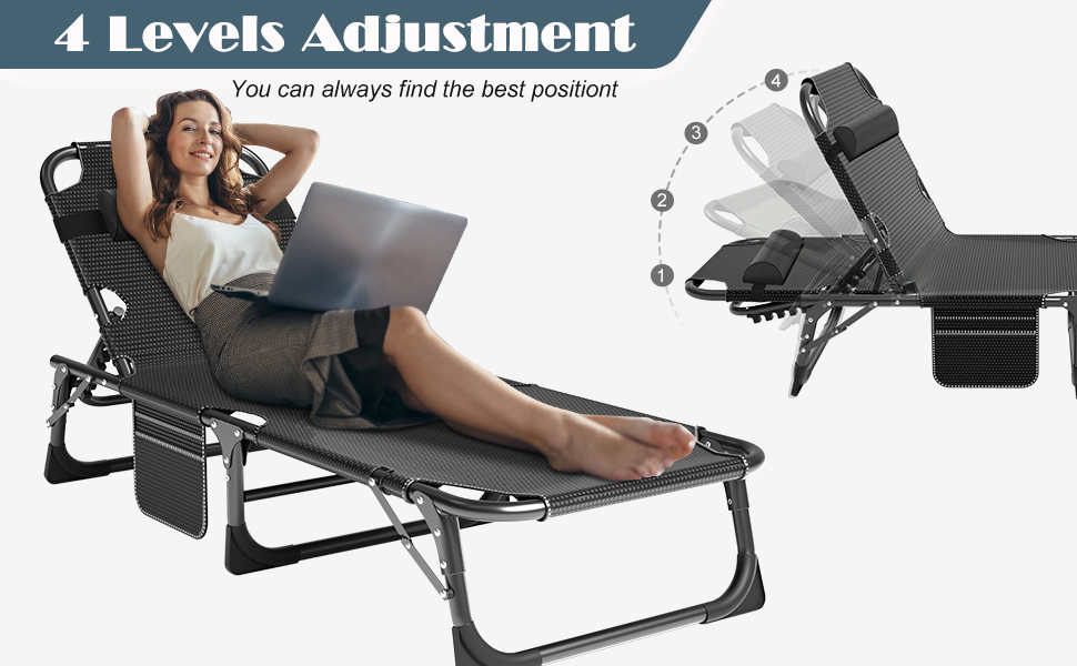 Double Layers 1200d Polyester Fabric【DURABLE FRAME】: The adjustable lounge chairs is made of durable 1200D oxford fabric and sturdy tube that can last for a long time. Supports up to 440 lbs. The reclining cot provides optimal relaxation and support to you with ergonomic design.【4 POSITIONS ADJUSTABLE】: The adults reclining folding chaise is designed with 4 positions adjustable locking system, which allows you to adjust it to a comfortable position according to your needs. You can sit up, recline or lay flat.【FOLDING CAMPING COT】: The portable adjustable folding cot unfold size: 75.2"x26.8"x13", folded size 30.7" x 9.8",very easy to carry. Perfect for relaxing at home, by the pool, at the beach or as a comfortable place to sleep while camping.【REMOVABLE MAT & PILLOW】: The folding lounge chair cot have various mattress options. The pad is removable and comfortable. The lounger chair also has a side pocket, to place your phone, books or keys; the pillow is detachable and removable, can be adjustable up and down or removed based on your own needs.【MULTIFUNCTIONAL LOUNGE CHAIR】: The sleeping cot is ideal for outdoor and indoor using. Perfect for camping, hiking, traveling, hunting, patio, pool, beach, outdoor grass, forest, deck, tent or cabin and any places you need to sleep, or as a nap cot in the office, a temporary guest bed at home.
