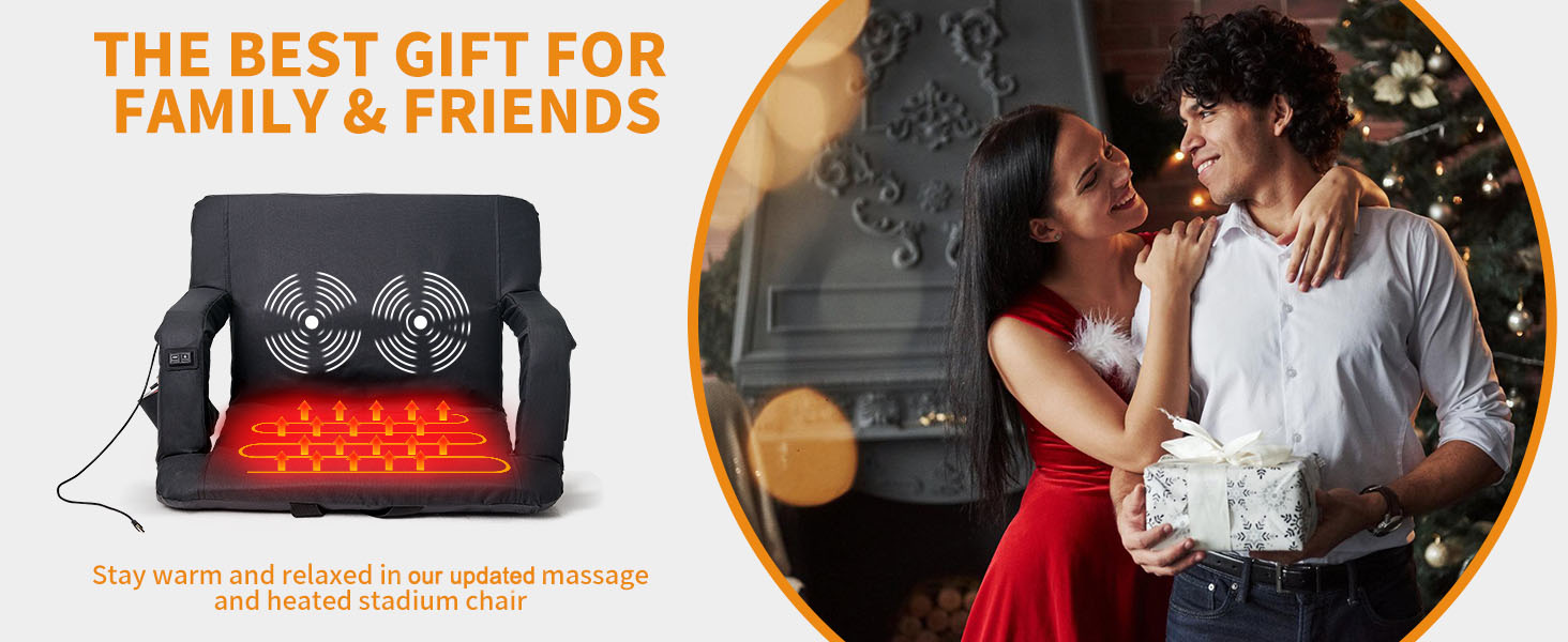 【Unparalleled Comfort】: Experience a new level of comfort with our extra thick padded back support and armrest, ensuring that every moment spent in the heating massage stadium seat is pure bliss. Say goodbye to tension, our massage feature relaxes the body and keeps you refreshed and energized even after long hours of sitting. 【Stay Dry and Secure】: Folding bleacher chair with 600D Waterproof Polyester Fabric, Our heating massage seat ensures ultimate protection against moisture and durability that lasts. No more worries about getting wet or dirty. The water-resistant reinforced PVC underside guarantees a skid-free seating experience, keeping you safe and secure. 【Customizable Heat and Vibrations】: Pamper yourself with the heated seat and back massage function. With three different settings for both heat , you can personalize your experience to perfection. The safe and soothing warmth penetrates your body, delivering a truly relaxing and comfortable sensation. 【Find Your Perfect Angle】: Discover unmatched versatility with our adjustable reclining feature. Choose from six different angles to find your ideal sitting position for ultimate relaxation, immersive viewing, or any purpose you desire. Elevate your comfort and make every moment count. 【Convenience at Your Fingertips】: Designed with your convenience in mind, our seat features multi-purpose pockets made from water-resistant materials. Enjoy hassle-free storage for your belongings, always within reach. The universal-sized design caters to various users, while the added shoulder straps ensure easy transportation. 【UPGRADE MORE STABLE&2 FIXED METHODS】 Our Stadium seats for bleachers designed with 2 hooks and one fix strap for more stable use. It can be secured easily and quickly to most bleachers and benches. Which is not easy to move and more stable.NOTE:The hooks are hidden inside the bottom zipper. 【WIDELY USED】Our heated massage stadium seat is an excellent choice for any sport such as football, baseball, basketball, Olympics, World Cup, as well as outdoor activities, adventures, beaches, parks, camping, and travel. Stadium seats for bleachers are perfect for those who spend long periods of time with their children during training or waiting on the sidelines of sports events. Say goodbye to hard, chilly bleachers!