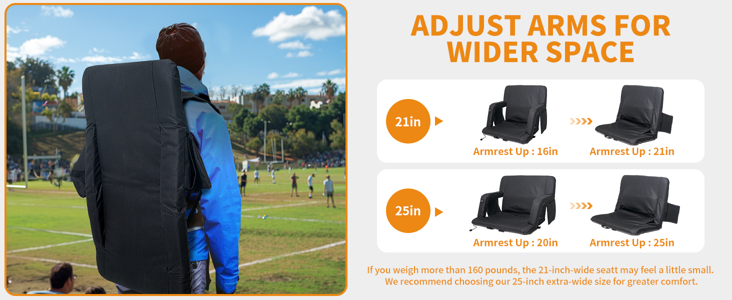 【6 RECLINING POSITIONS】 The heated bleacher seats can avoid the muscle soreness caused by sitting for a long time, you can focus more on your game or performance. The heated stadium chair has 6 reclining options, you can choose the most comfortable position to enjoy your happy time.