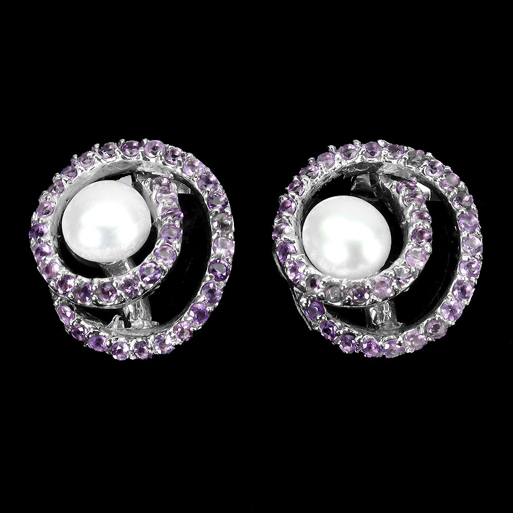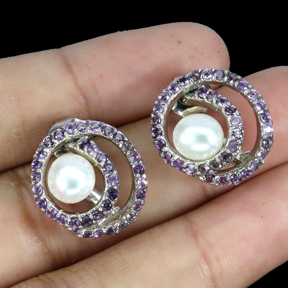 925 Sterling Silver Earrings Round Amethyst Pearl Natural Gemstone Jewelry
