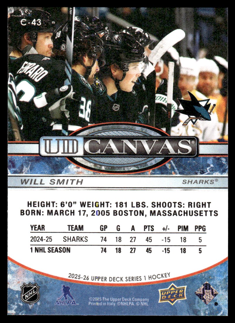 | 2025-26 Upper Deck Series 1 UD Canvas Will Smith San Jose Sharks #C-43 |