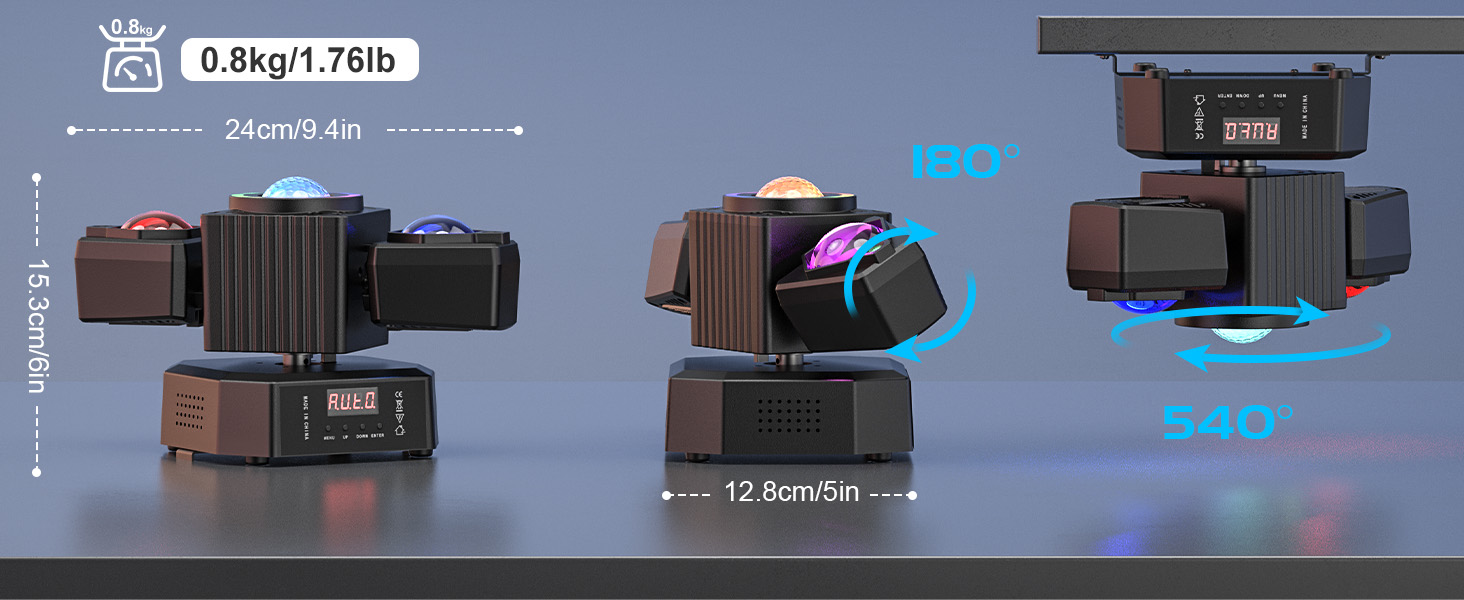 2.Flexible Projection and Rotation: The 2-arm RGBW beams can project four horizontal beams easily. With 180° rotation and 540° free rotation on the X-axis, it can produce gorgeous dancing lights.