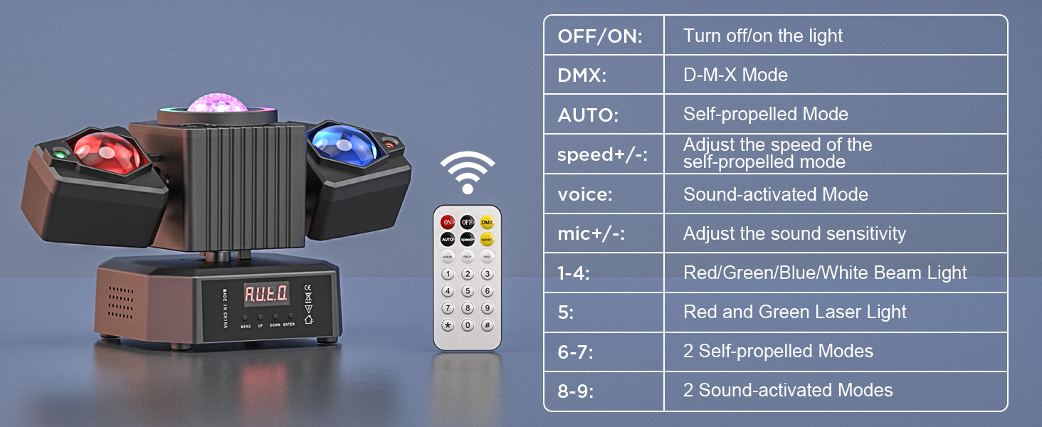 Operation mode: automatic, voice control, DMX,master-slave mode,remote