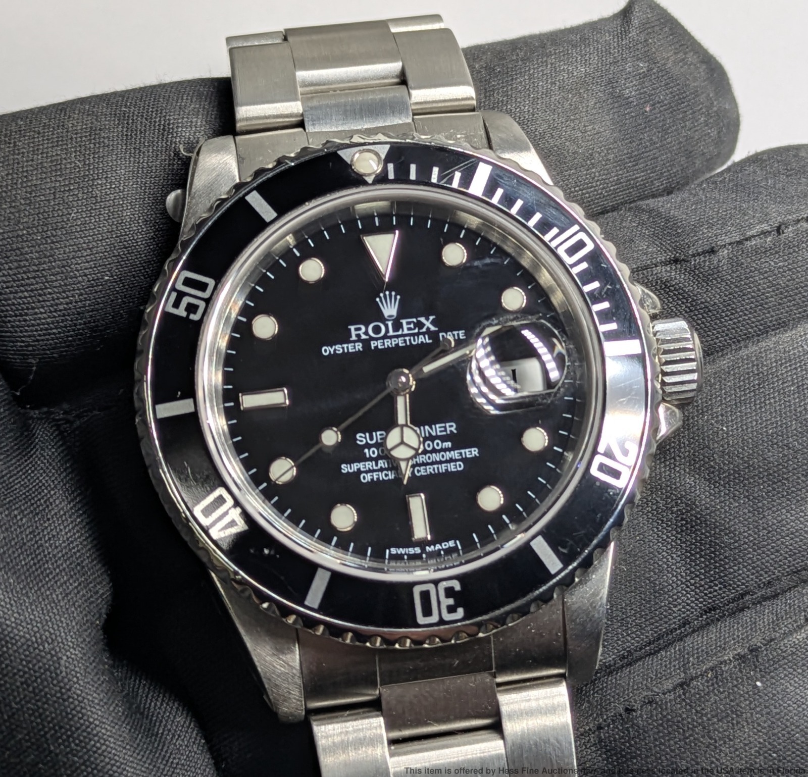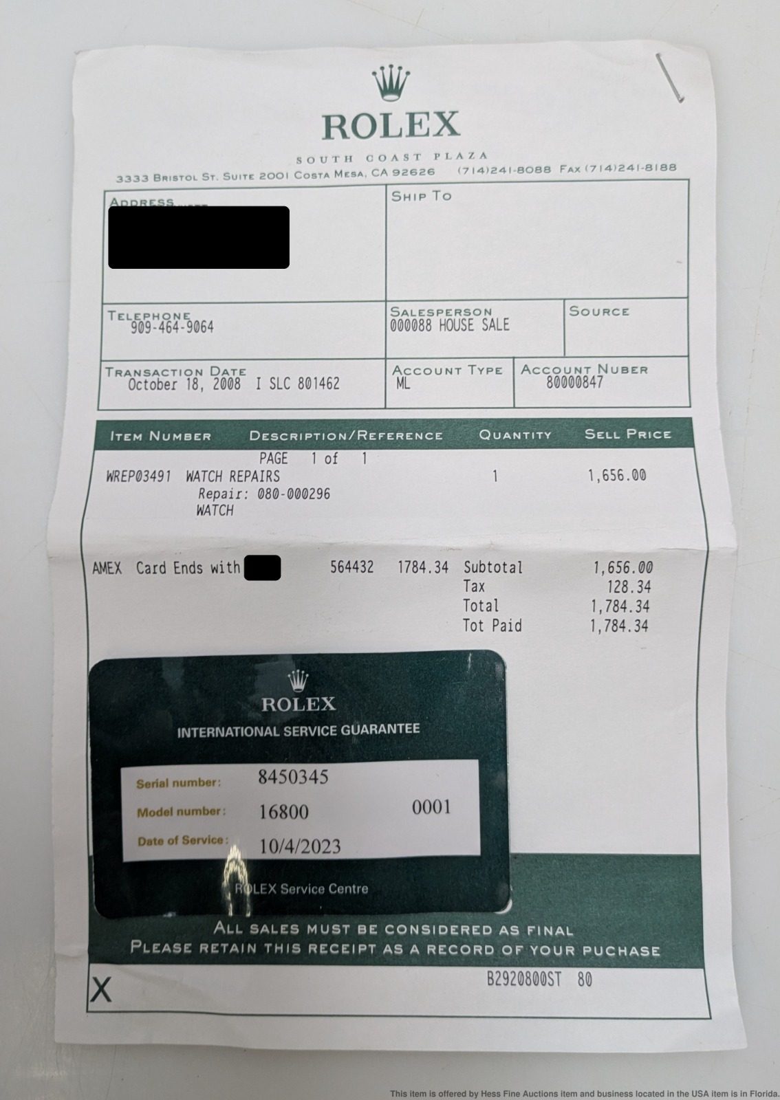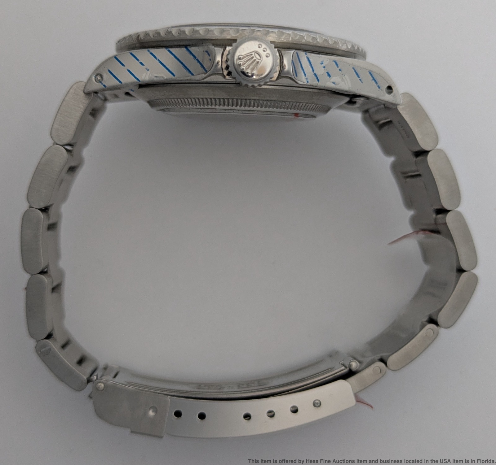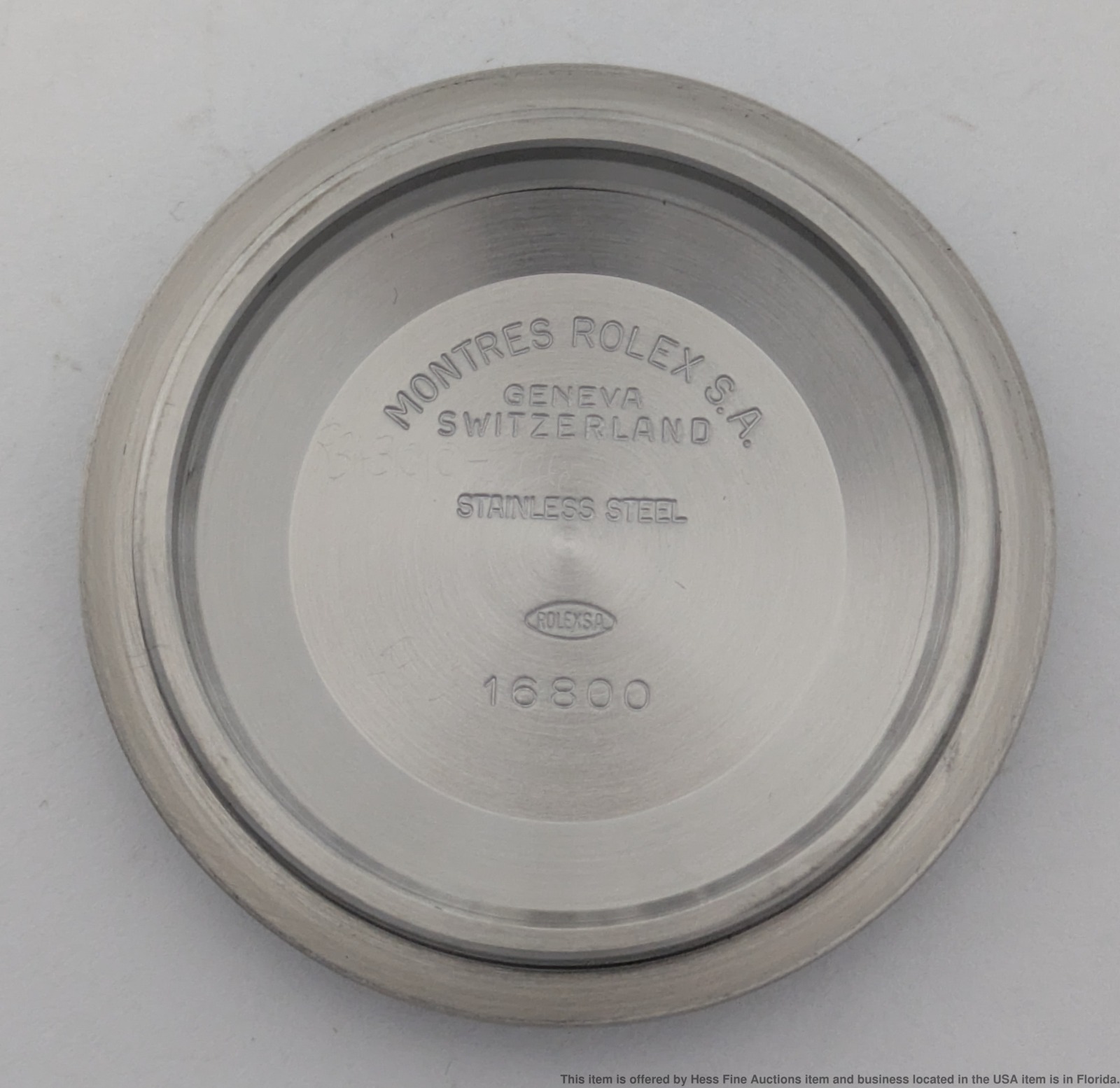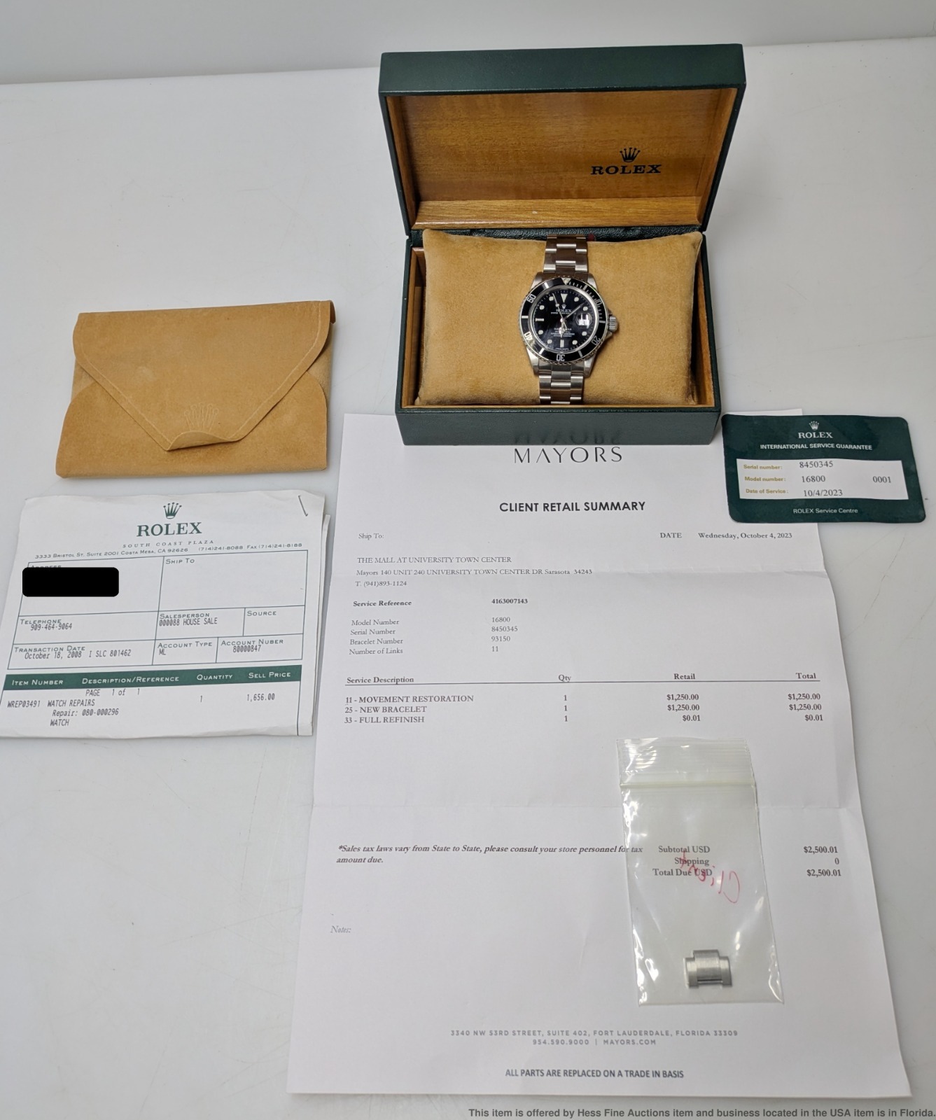 - Described By: Dillon 68810 NMDDD Title: Recent Factory Serviced Rolex Submariner 16800 Mens Date Automatic Wrist Watch Box Paperwork Description: Recent Factory Serviced Rolex Submariner 16800 Mens Date Automatic Wrist Watch with box, papers showing service, and an extra Oyster link. See photos for details. Serial: 8450345 Reference: 16800 Caliber: 3035 Condition: Recent factory service with minimal use overall! Black dial shows minimal to no wear. Sapphire crystal shows minimal to no wear. Bezel shows minor scratch. Case surround and case back still have factory protective stickers. Bracelet shows minor wear along the end link and minimal to no stretch. See photos for details. Movement Condition: Movement is running, for optimum timekeeping accuracy we suggest an overhaul at buyers expense Case Diameter: 40mm Case Thickness: 13mm Lug End to End: 47mm Lug Width: 20mm Total Length or Circumference: 7-9 inch circumference Material: Stainless steel case, stainless steel Oyster bracelet, signed stainless steel folding clasp Year: 1984 Estimated weight of piece: 125 grams Box & Papers: Box and paperwork Estimated size of package: 12x10x3, 1 lb Additional Info: If the winning bidder would like to arrange to pick up their item at our store, please notify us by email and we will make the appropriate shipping adjustments.
