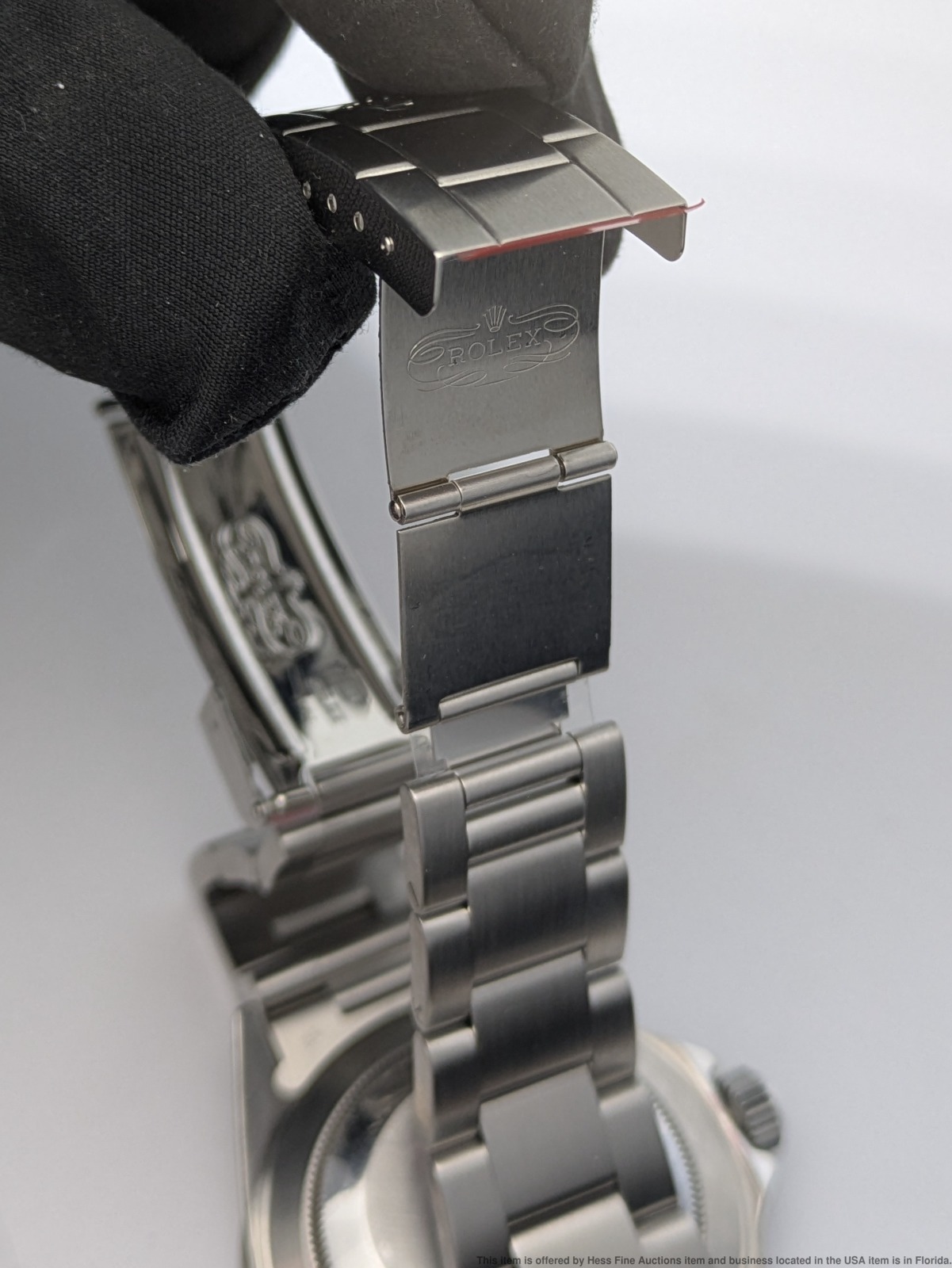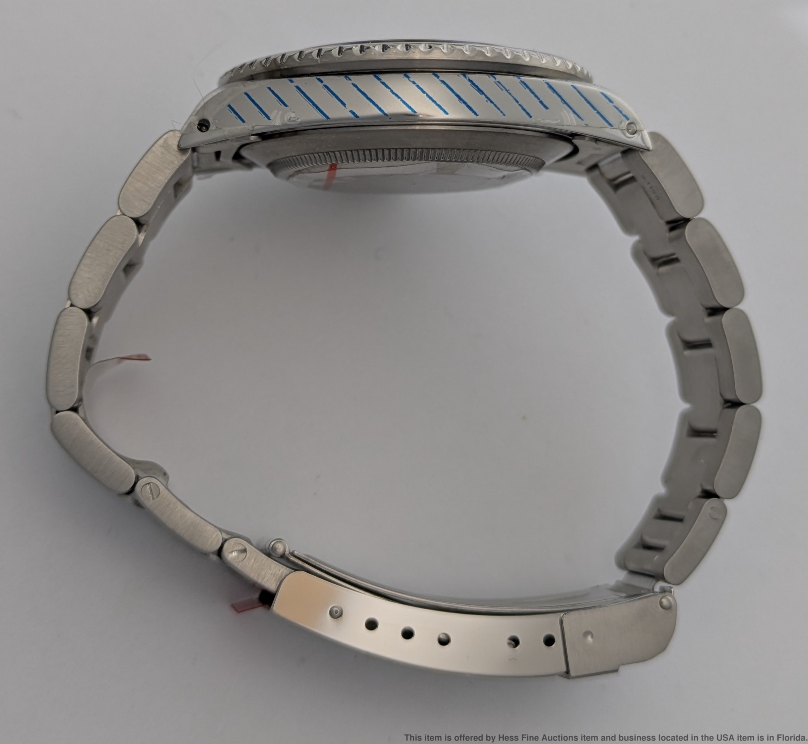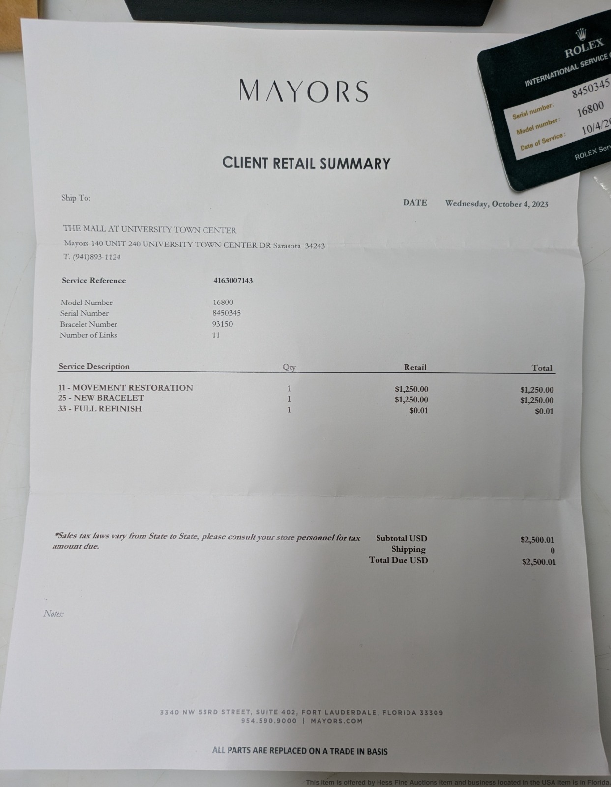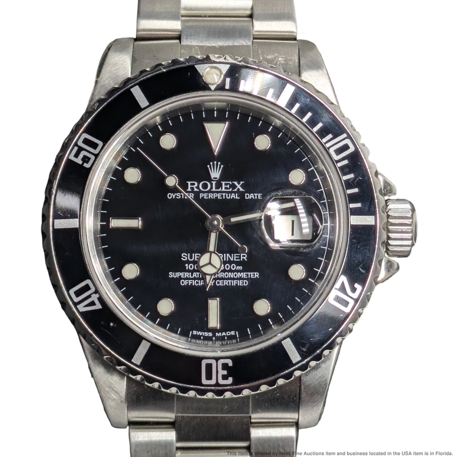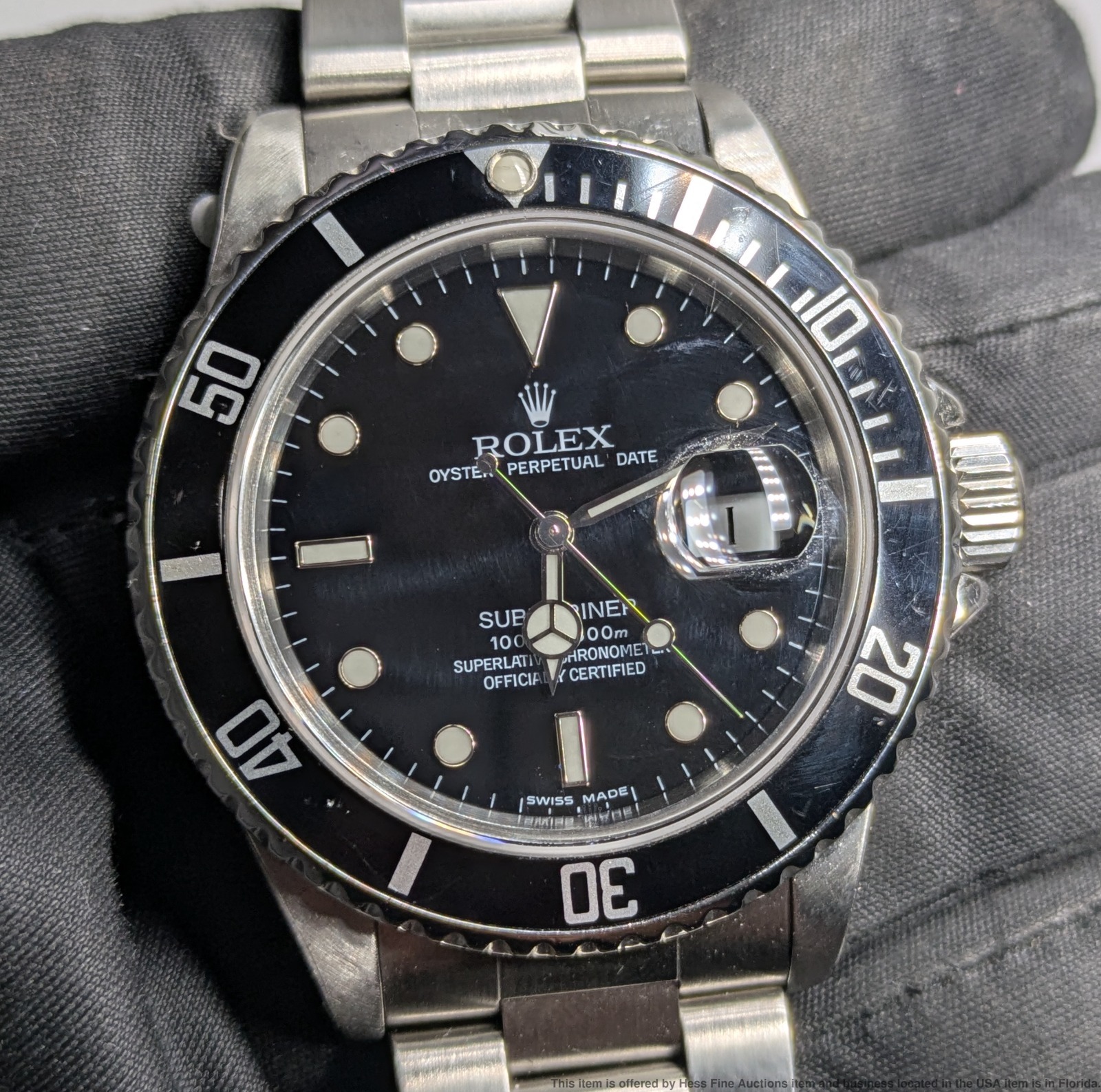 - Described By: Dillon 68810 NMDDD Title: Recent Factory Serviced Rolex Submariner 16800 Mens Date Automatic Wrist Watch Box Paperwork Description: Recent Factory Serviced Rolex Submariner 16800 Mens Date Automatic Wrist Watch with box, papers showing service, and an extra Oyster link. See photos for details. Serial: 8450345 Reference: 16800 Caliber: 3035 Condition: Recent factory service with minimal use overall! Black dial shows minimal to no wear. Sapphire crystal shows minimal to no wear. Bezel shows minor scratch. Case surround and case back still have factory protective stickers. Bracelet shows minor wear along the end link and minimal to no stretch. See photos for details. Movement Condition: Movement is running, for optimum timekeeping accuracy we suggest an overhaul at buyers expense Case Diameter: 40mm Case Thickness: 13mm Lug End to End: 47mm Lug Width: 20mm Total Length or Circumference: 7-9 inch circumference Material: Stainless steel case, stainless steel Oyster bracelet, signed stainless steel folding clasp Year: 1984 Estimated weight of piece: 125 grams Box & Papers: Box and paperwork Estimated size of package: 12x10x3, 1 lb Additional Info: If the winning bidder would like to arrange to pick up their item at our store, please notify us by email and we will make the appropriate shipping adjustments.