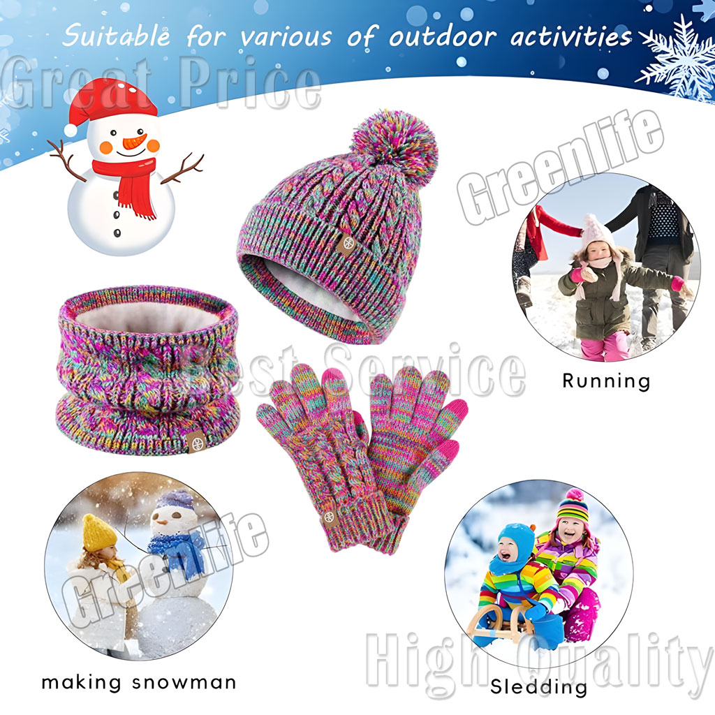 Our set includes a cozy beanie with a cute fur ball, adding an adorable touch to your child's outfit. The knitted thick thermal scarf and gloves are designed to cover the neck, ears, and hands, ensuring your child stays warm all the time.
