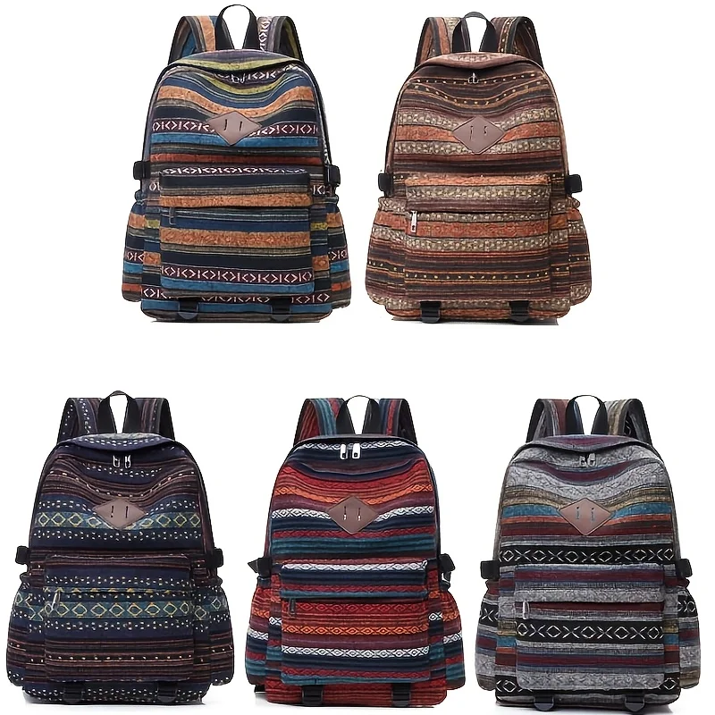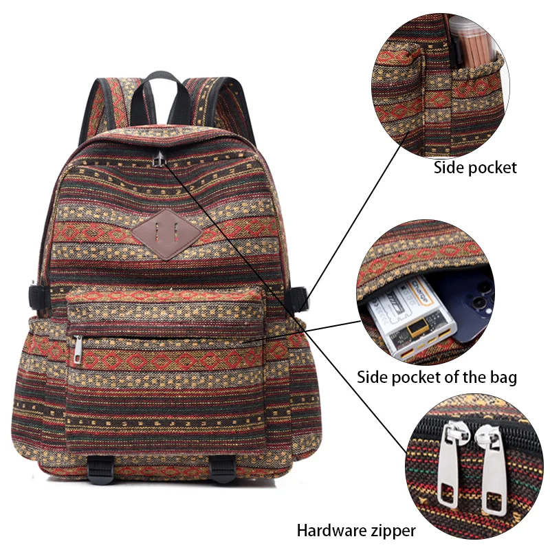 Unique Ethnic Pattern: Adorned with an intricate ethnic pattern, this backpack is a true standout. The rich colors and detailed motifs draw inspiration from traditional craftsmanship, ensuring you carry a piece of art wherever you go.