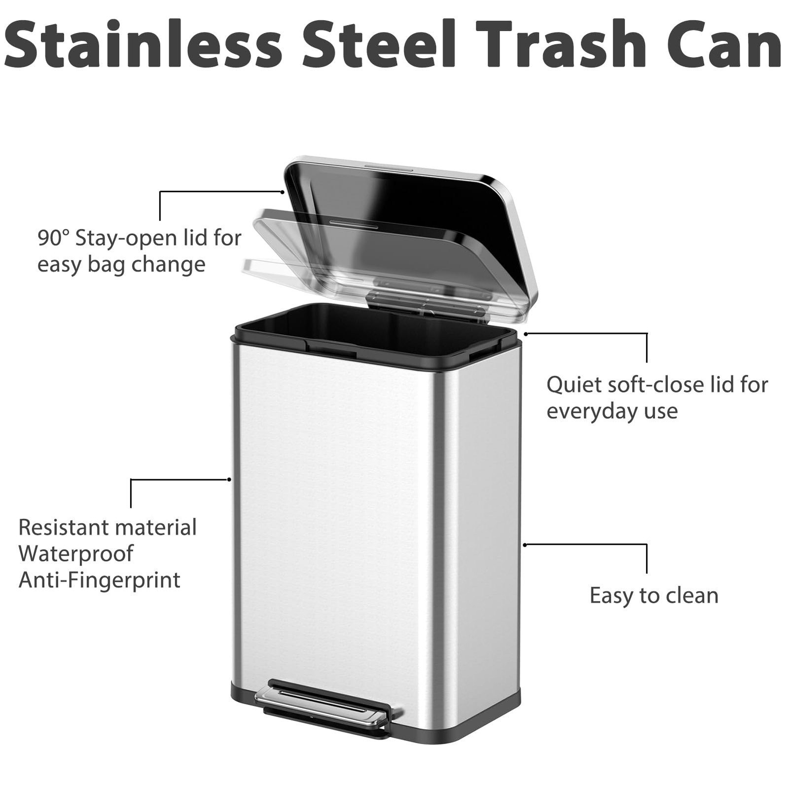 Premium Quality: The trash cans feature a removable inner bucket for easy trash disposal and a tuck and hold bag retention system to keep the bag securely in place. The lid also has a stay-open mode for convenient hands-free use. Constructed with -grade stainless steel and equipped with rubber pads on the non-skid base, these garbage cans are durable and reliable.