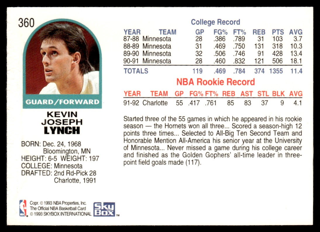 1992-93 Hoops Kevin Lynch Charlotte Hornets #360
