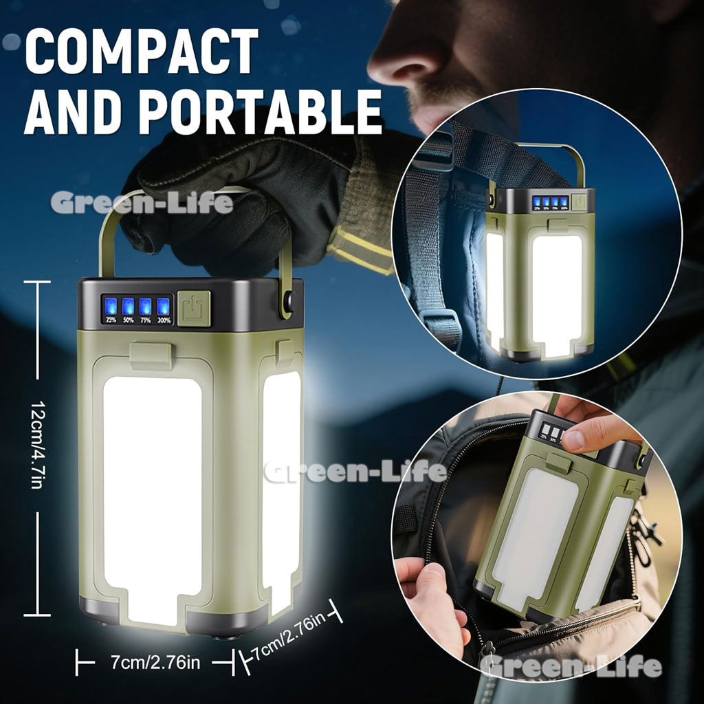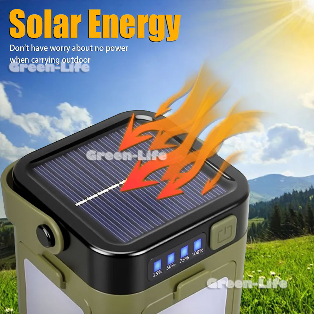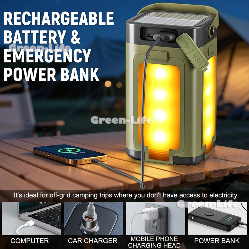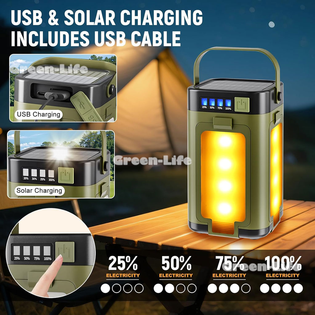 【Dual Charging: Solar & USB-C】Featuring a built-in 2000mAh high-capacity rechargeable battery, this camping lamp delivers up to 5-10 hours of runtime once fully charged. It supports both solar and USB charging—harnessing solar energy for eco-conscious use, or quick USB top-ups when sunlight is limited.