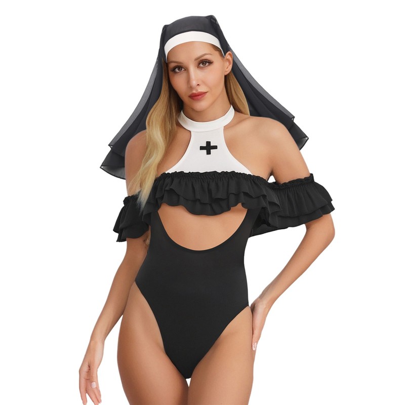 The mesh long-sleeve details give an edgy and mysterious vibe. Gold cross patchwork at the chest is a clear element of nun.