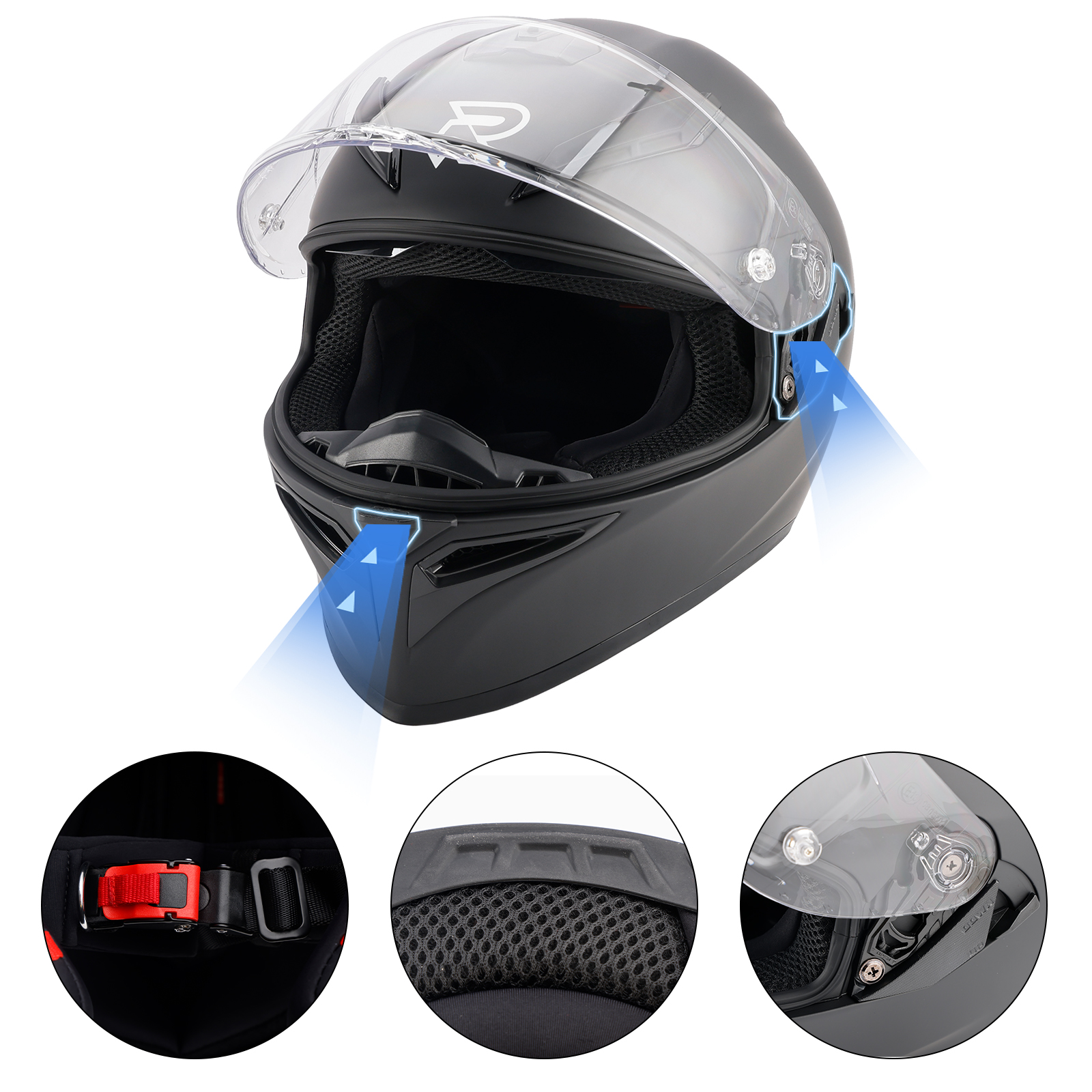 Full-face helmet is engineered with an advanced composite shell for Meet or Exceed FMVSS No. 218 and DOT Safety Standards, ECE 22.05 Certified,ensuring you are safeguarded against impacts and abrasions during your ride.The reinforced chin strap with a secure buckle system adds an extra layer of security and easy to use.