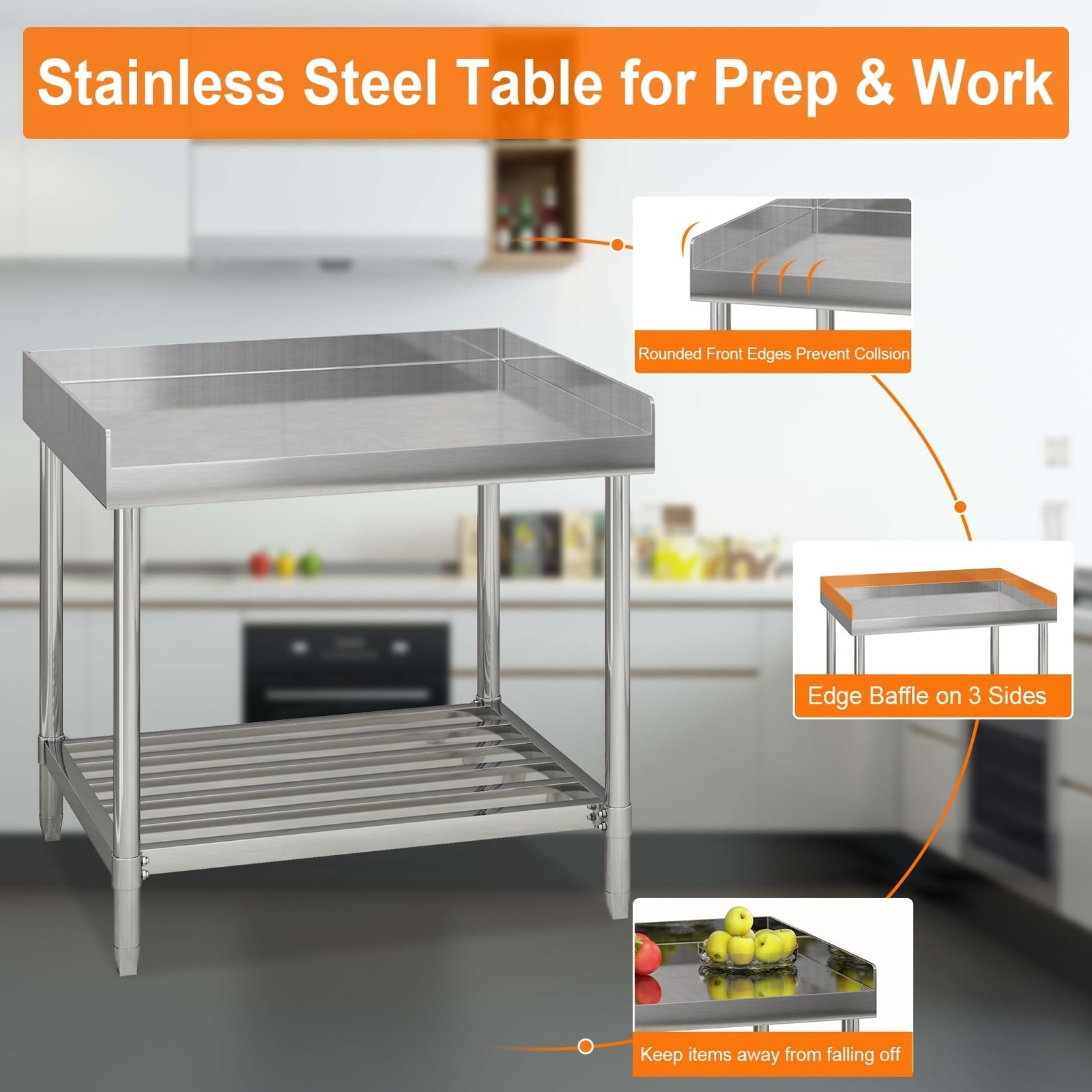 ---Enhanced Safety Features: The rounded corner design of the table and backsplash helps to prevent injuries, making it a safe and user-friendly option in a kitchen or commercial setting. The smooth stainless steel material is lightweight and easy to install, providing a convenient and safe work surface that can also be easily removed when needed.