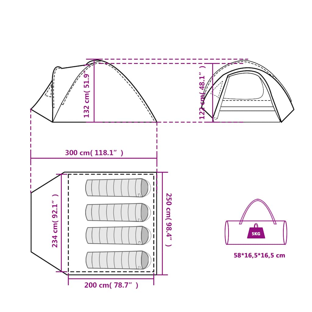 Dimensiones exteriores de la tienda: 300 x 250 x 132 cm (largo x ancho x alto)
