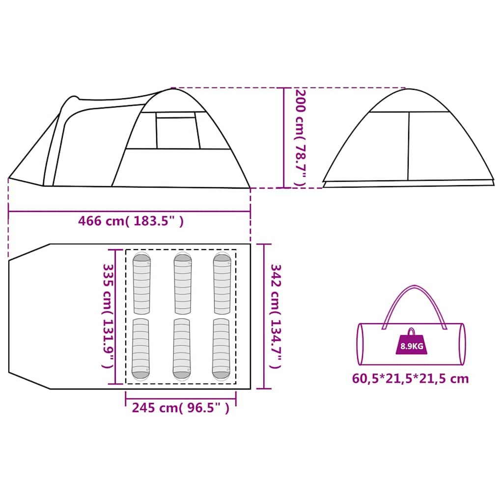 Dimensiones exteriores de la tienda: 466 x 342 x 200 cm (largo x ancho x alto)
