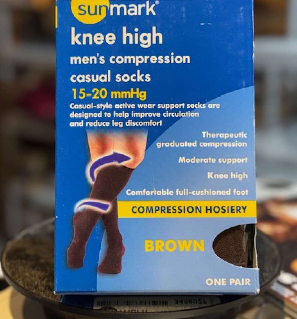 The Sunmark Men's Compression Casual Socks (15-20mmHg Brown) feature a casual style with moderate, graduated compression to improve circulation and reduce leg discomfort.