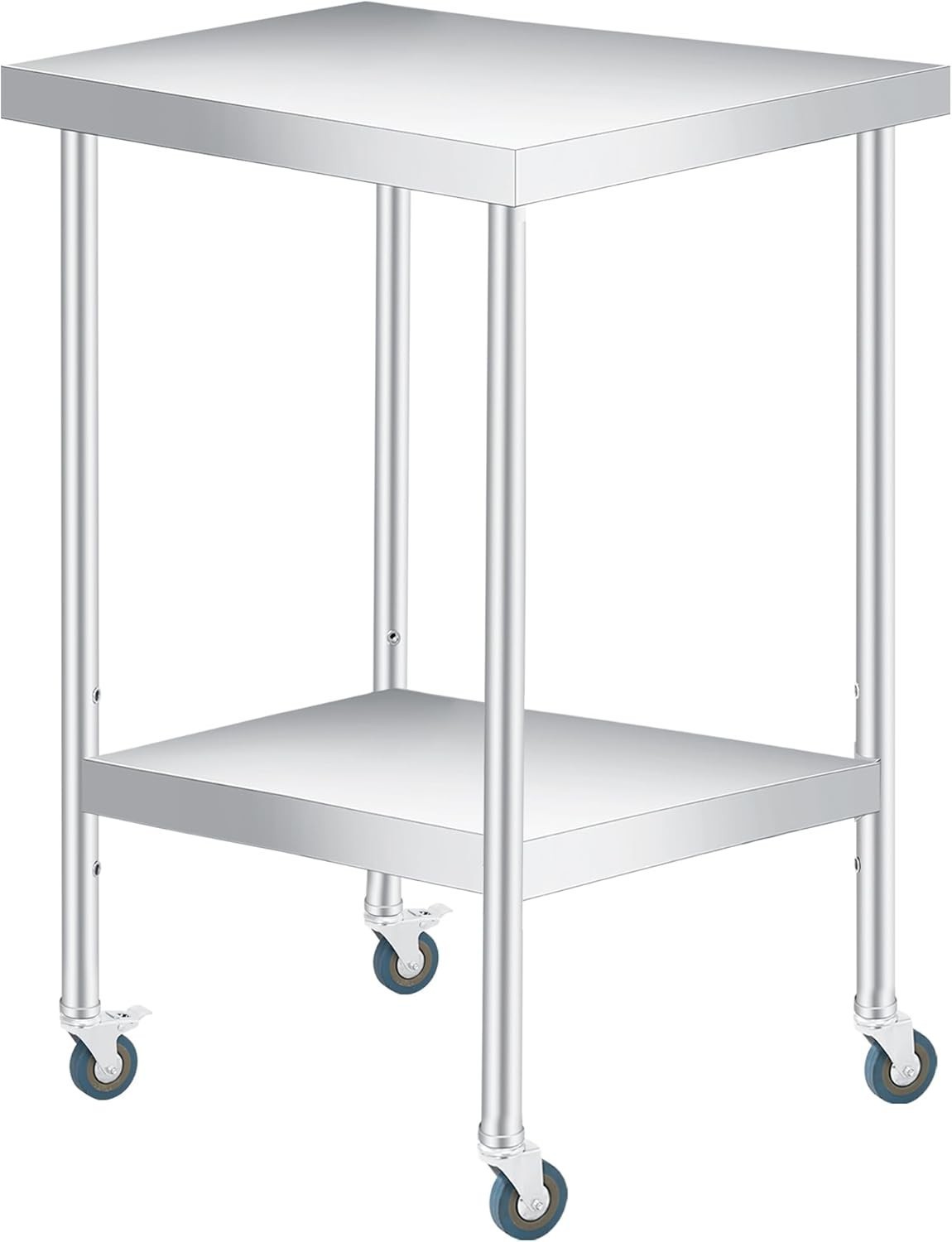 【Commercial-Grade Stainless Steel Cart & Work Table】Made of high-strength, corrosion-resistant stainless steel, this NSF-certified table has a smooth, easy-to-clean surface. Ideal as a heavy-duty prep table, food cart or mobile work station for commercial/home kitchens, garages, etc.