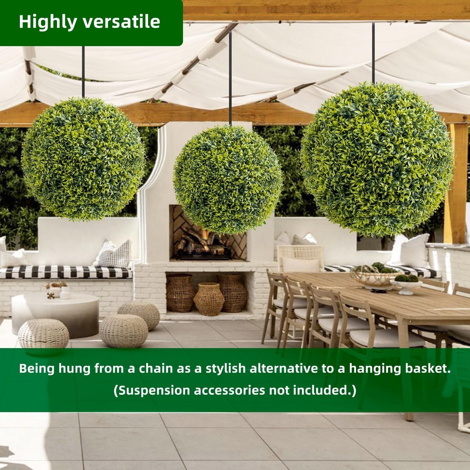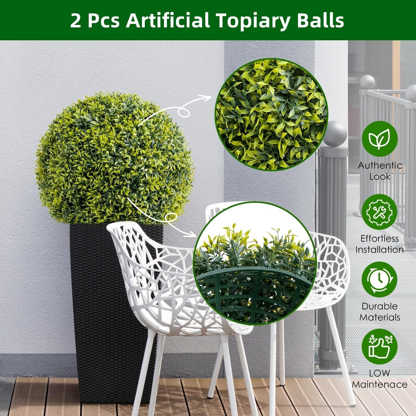 【 Quick Assembly & Secure Installation】Every Lifelike Artificial Boxwood Ball set includes two interlocking halves, along with 3-way hanging chains and 20 zip ties for versatile and secure display options, both indoors and outdoors.