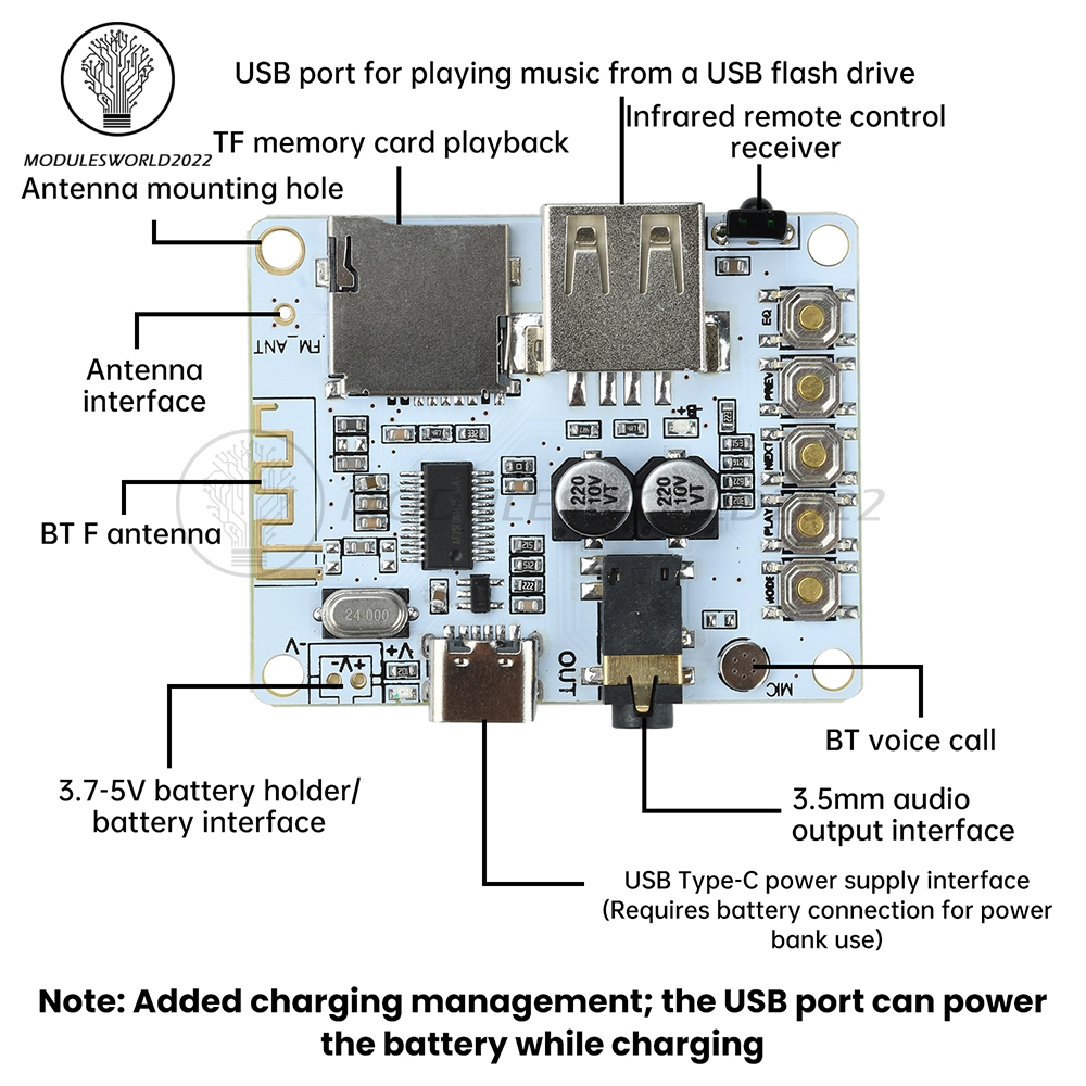 Functions: Bluetooth reception, USB/TF playback, radio functionality