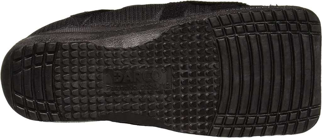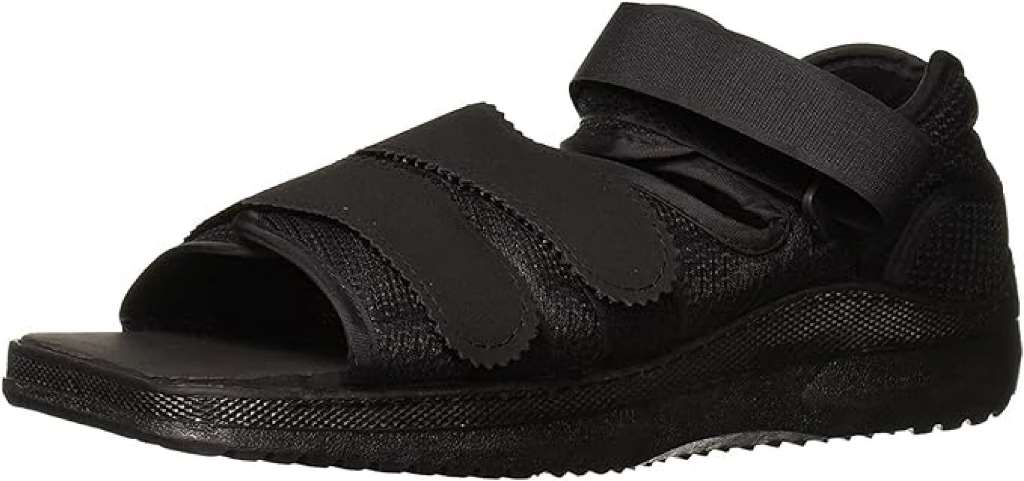 The Darco Med-Surg Black Square-Toe Shoe offers post-op protection with a square toe for protection, a strapless closure for large dressings (up to 17" circumference), an anti-slip ankle strap, and a rocker sole to reduce pressure, plus an adjustable insole for custom off-loading, all designed to keep feet safe and comfortable after foot surgery.