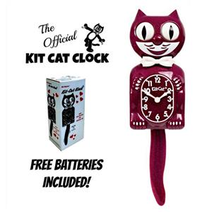 This is an official, brand new full sized Kit-Cat Clock - the iconic time piece with moving eyes and wagging tail that's brought a smile to generations of customers. This is the Limited Edition Ruby Red Kit-Cat Clock released in the Fall of 2024. This deep ruby red color coupled with a unique metallic flake finish creates an eye-catching look that makes it glitter and shine. Assembled, it's 15.5" tall (from tip of ears to tip of tail). It runs on 2 'C' batteries, and we include your first two batteries free with purchase. This wall clock comes complete with assembly instructions and a 1 year guarantee & warranty from the manufacturer. Made in the USA since 1932!