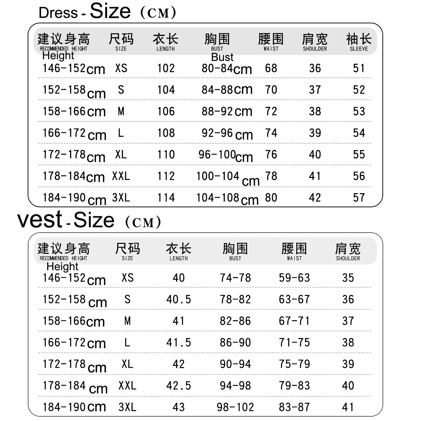 | Size | Height (cm) | Bust (cm) | Waist (cm) | Weight (kg) |
