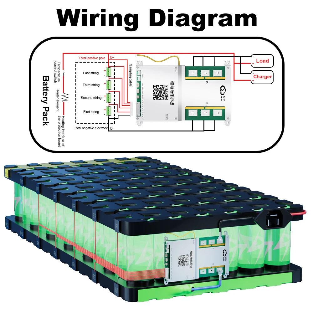 (1) Connect the protection board and battery pack according to the following wiring diagram,Make sure that the last power cord is also Connected to the main positive pole,The total voltage of the battery pack must be greater than 20V(Default BMS)/10V(4S BMS) before tarting up.
