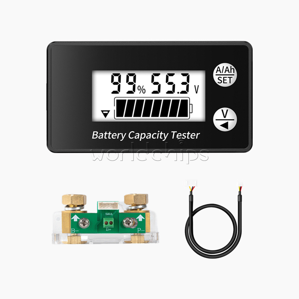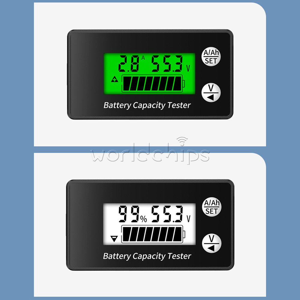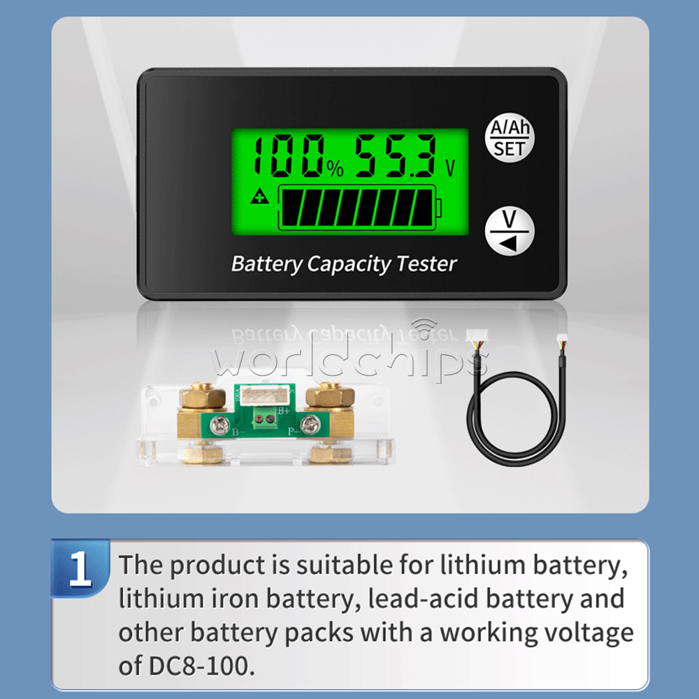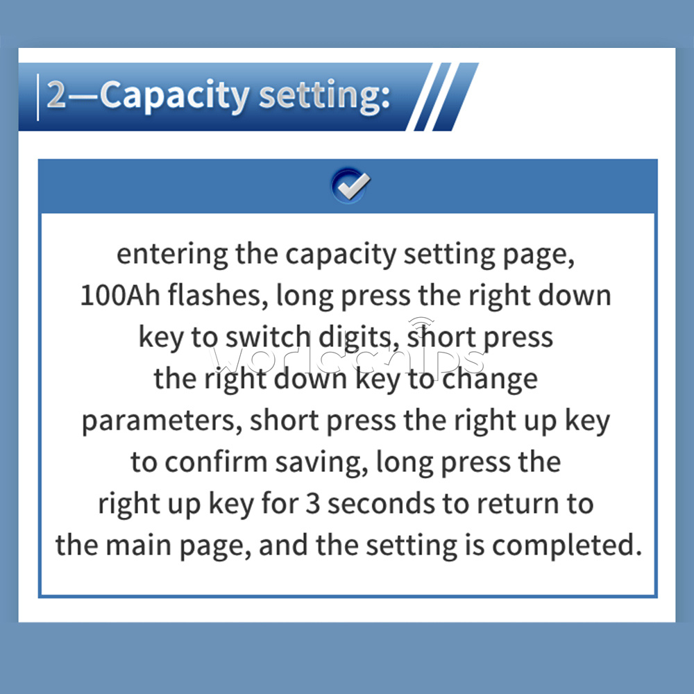 2. Capacity setting: enter the capacity setting page displaying 100Ah flashing long press the lower right button to switch the bit, short press the lower right button to change the parameters, short press the upper right button to confirm save, long press the upper right button for 3 seconds to return to the main page, the setting is complete.