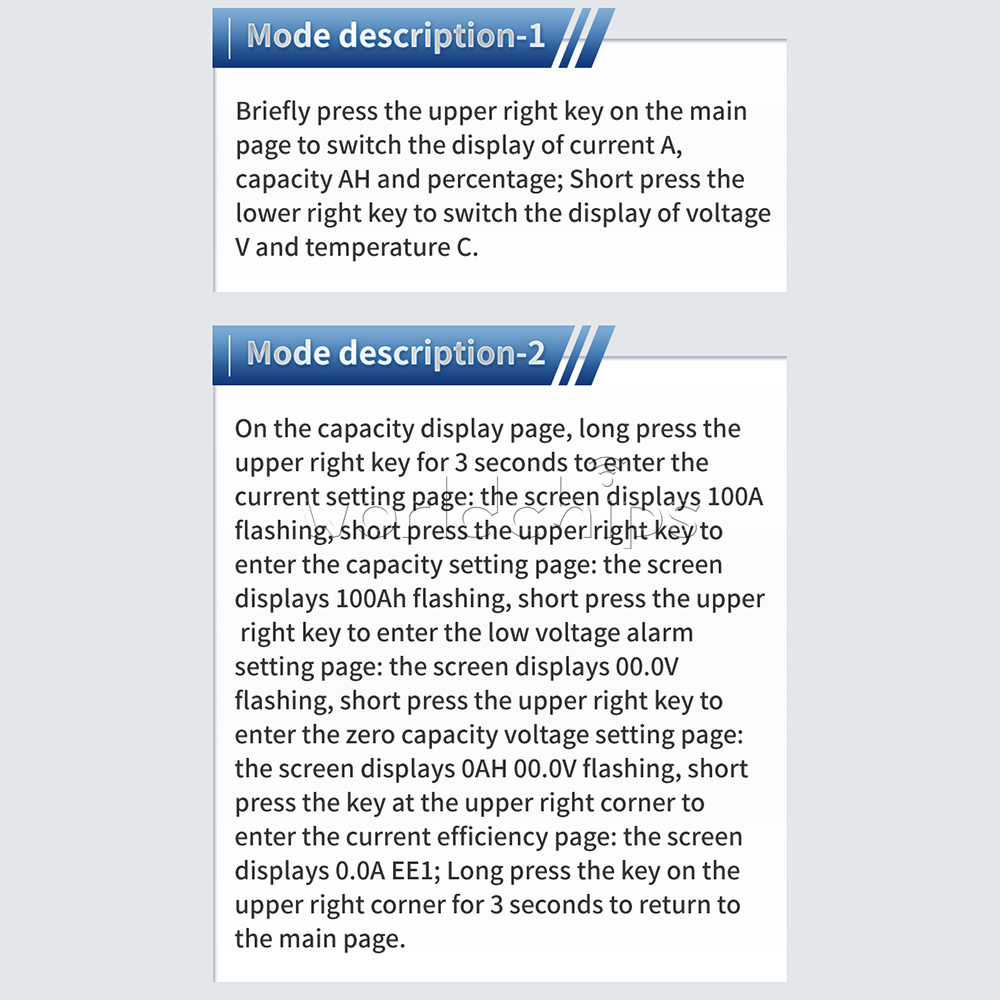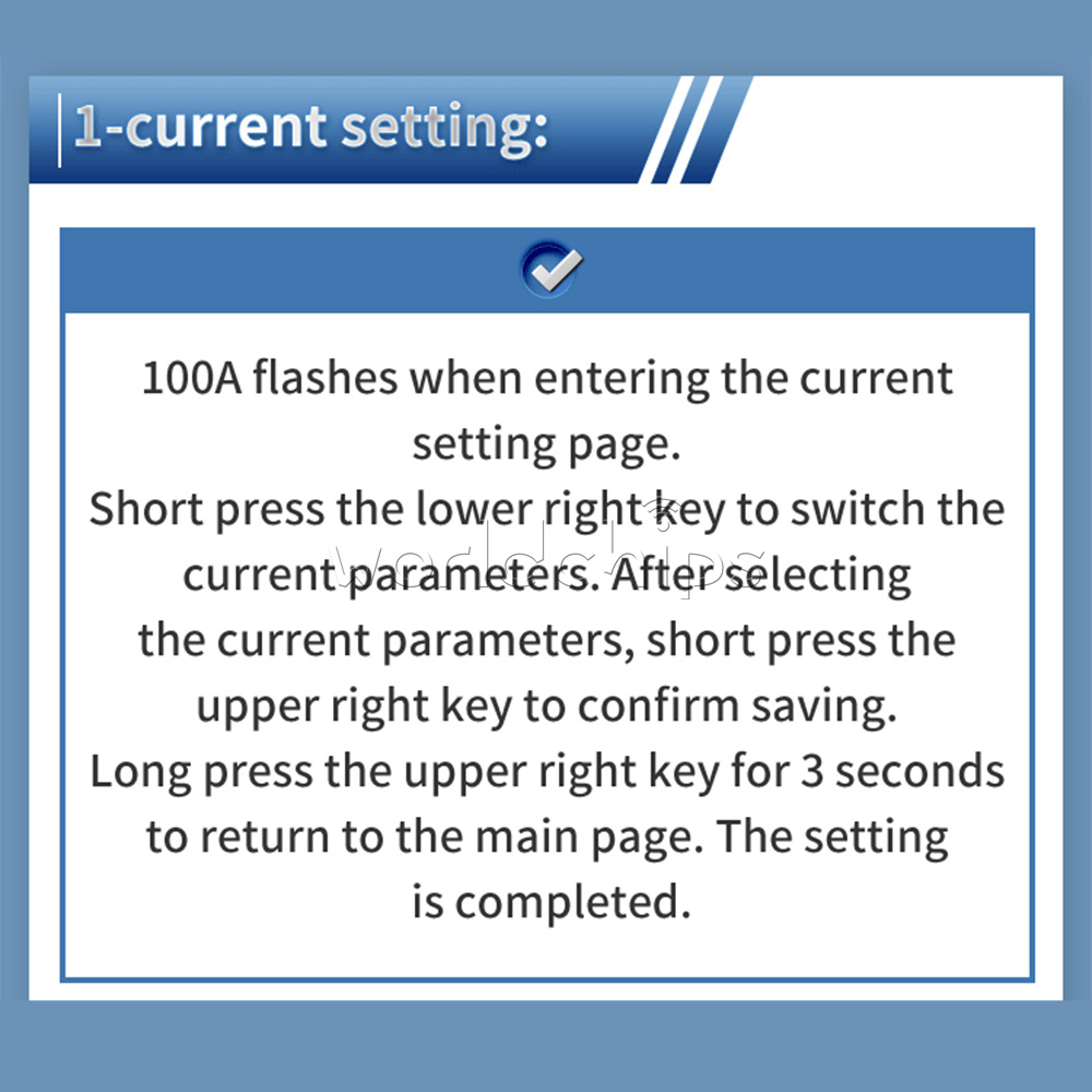 1. Current setting: enter the current setting page displaying 100A flashing short press the lower right button to switch the current parameters, select the current parameters, short press the upper right button to confirm save long press the upper right button for 3 seconds to return to the main page, the setting is complete.